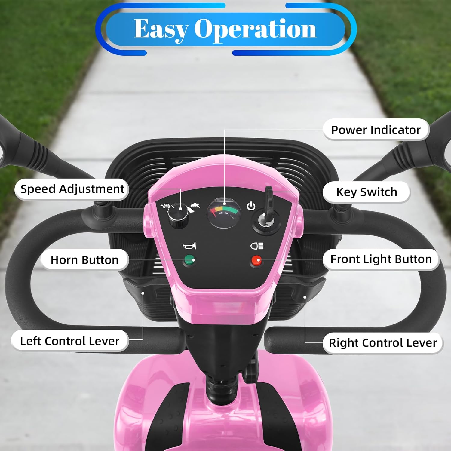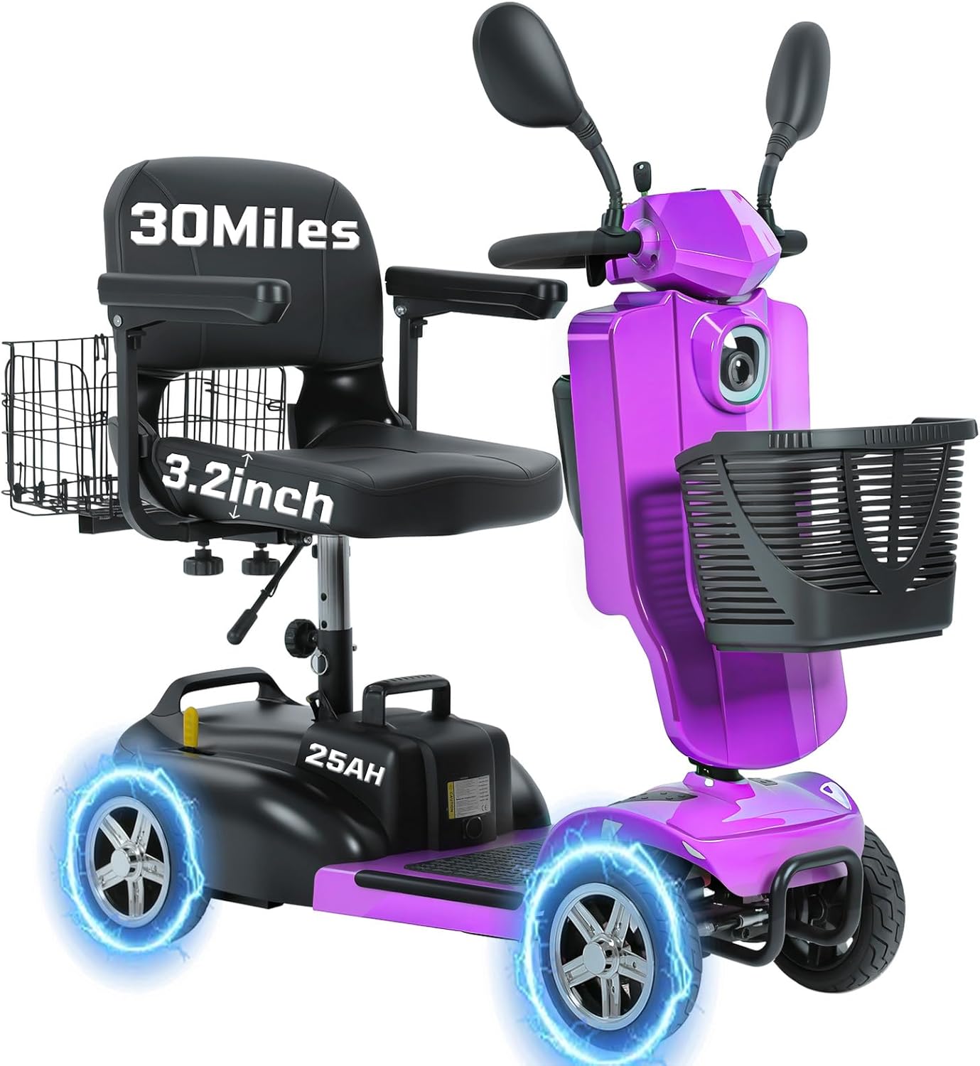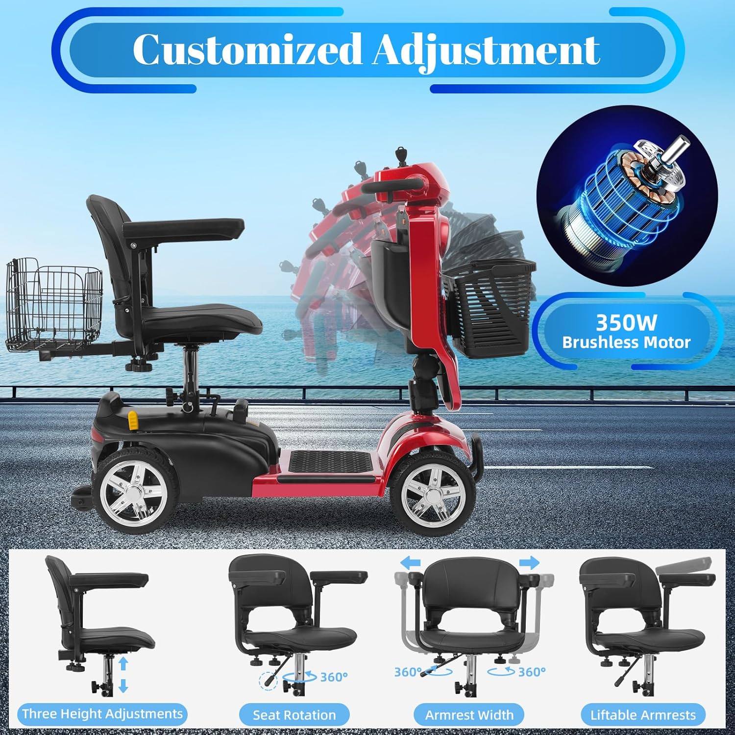 Foldable & Portable 4-Piece Design: Disassembles into 4 lightweight pieces for easy transport and storage. Foldable tiller, 360° rotating seat, and detachable front/rear baskets make it perfect for car trunks, closets, or small spaces.