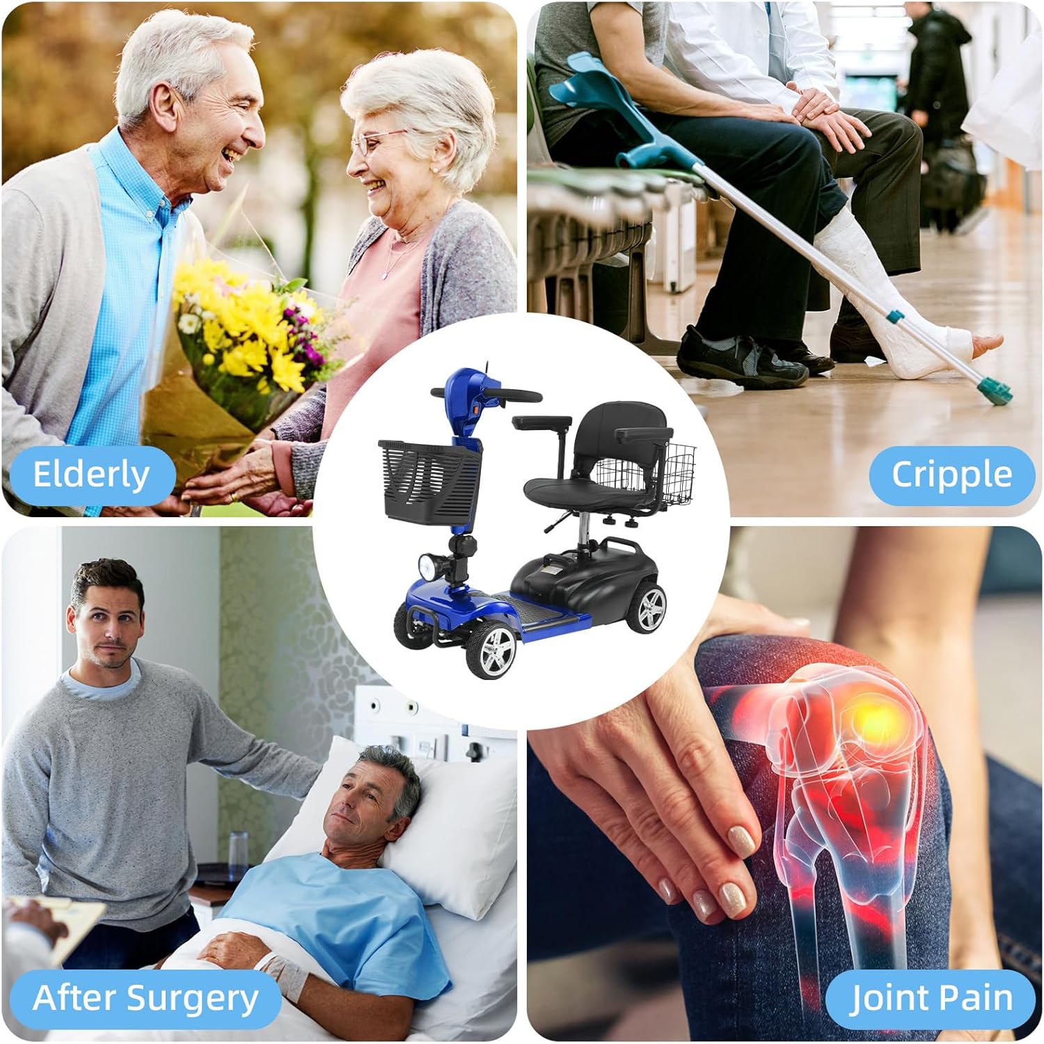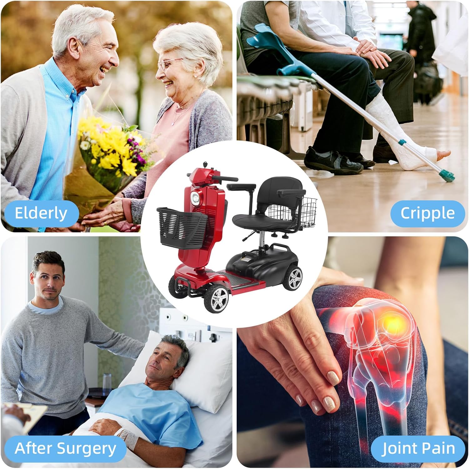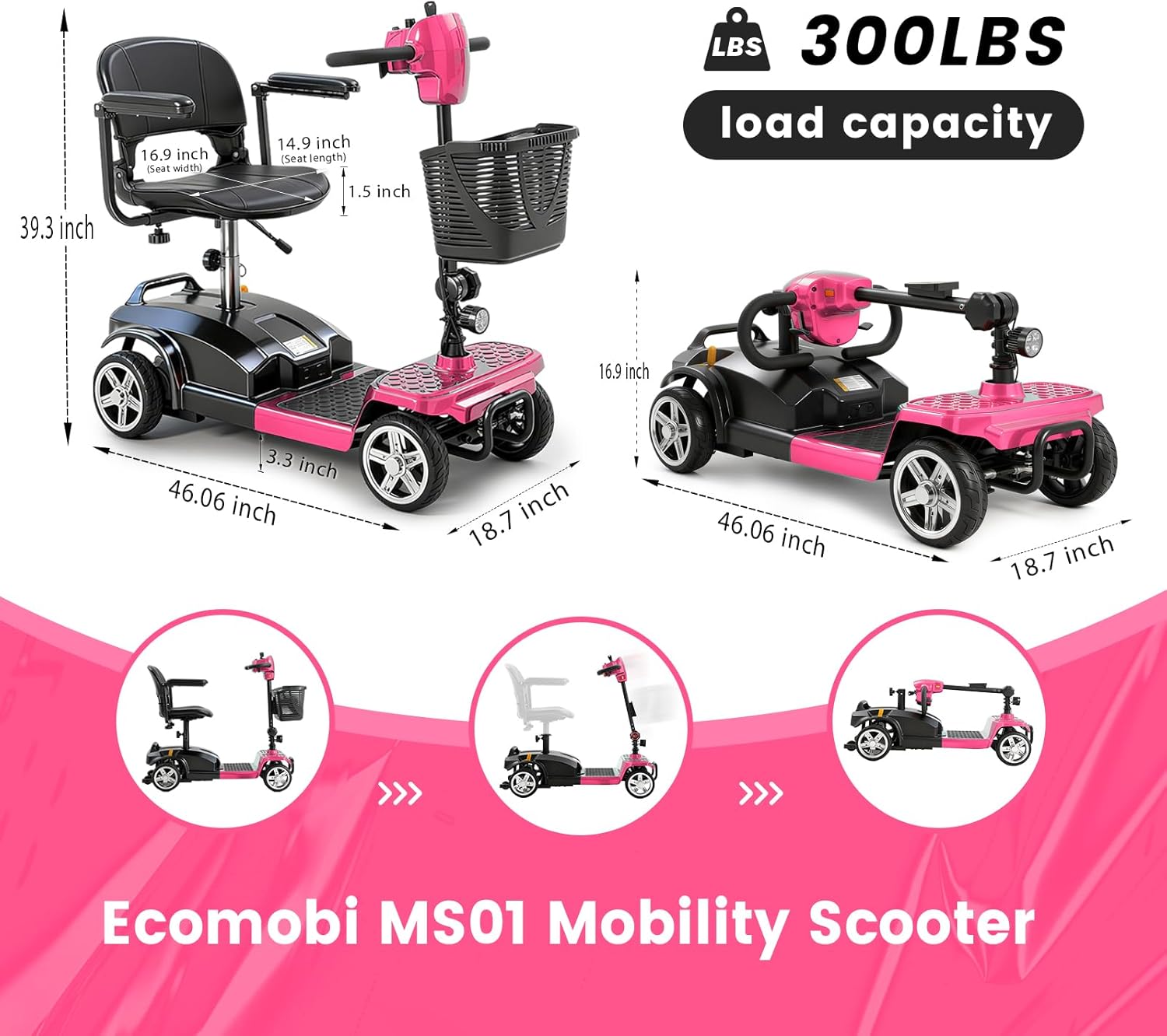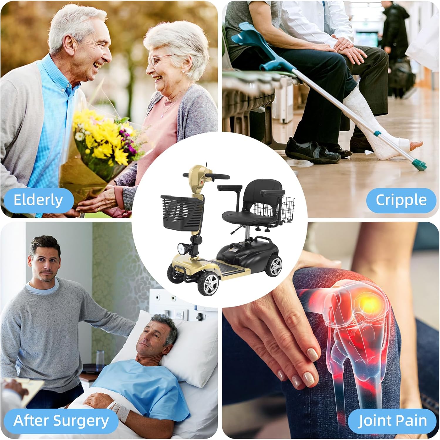 Foldable & Portable 4-Piece Design: Disassembles into 4 lightweight pieces for easy transport and storage. Foldable tiller, 360° rotating seat, and detachable front/rear baskets make it perfect for car trunks, closets, or small spaces.
