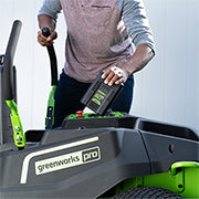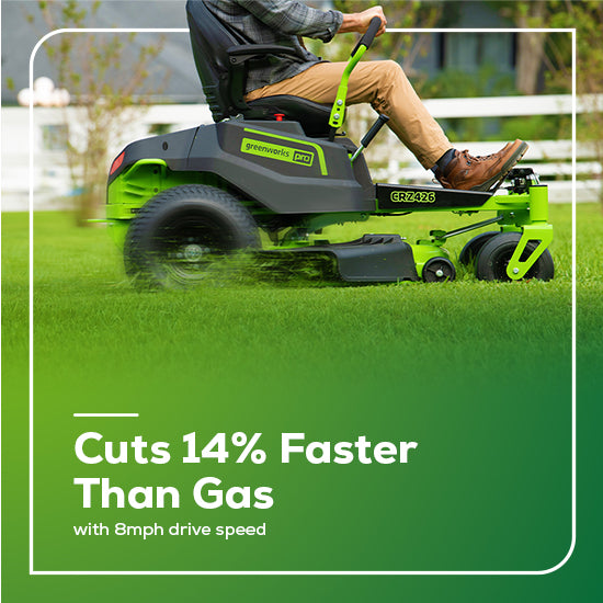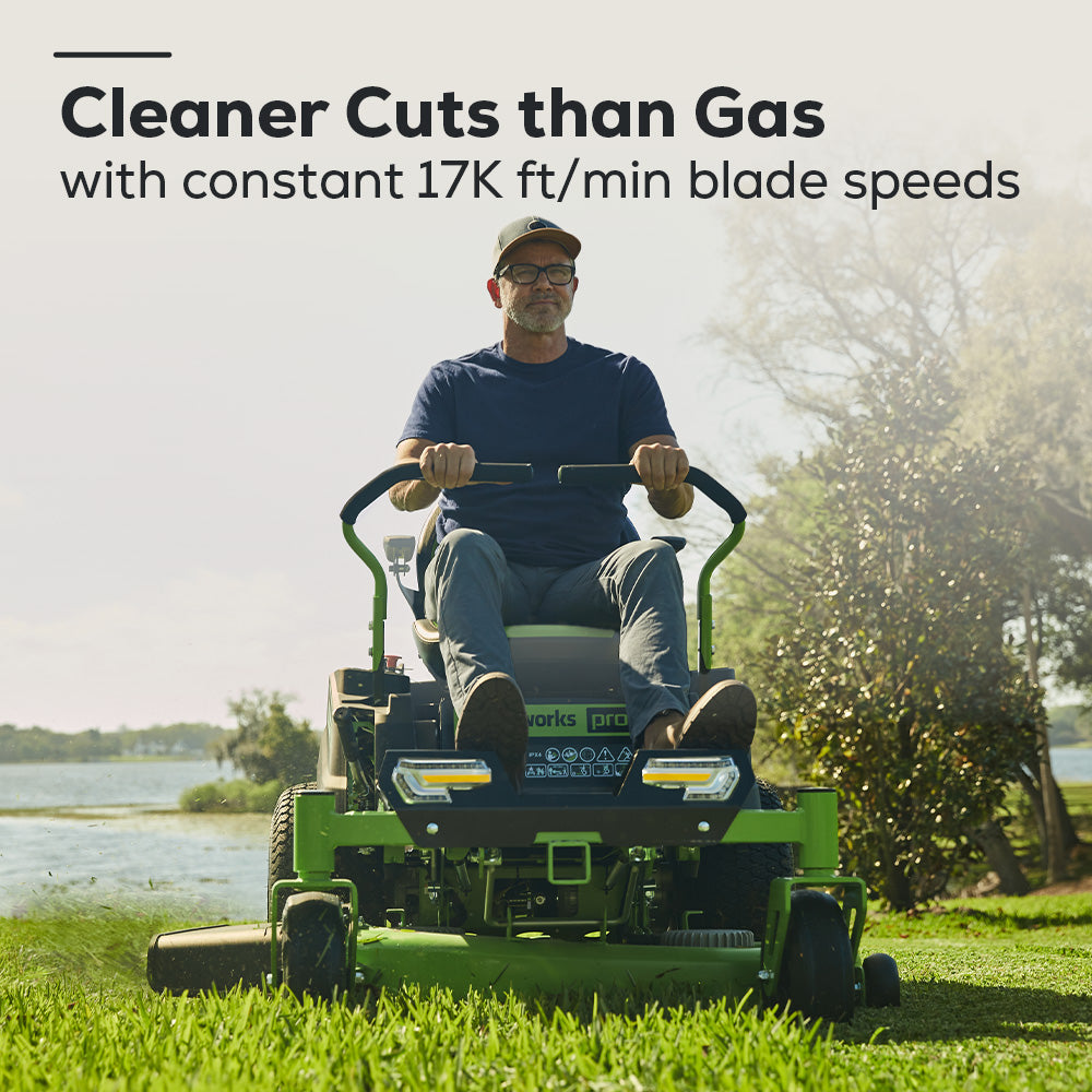 The Greenworks 60V Zero Turn features the most advanced power-cutting system in the industry. Where gas mowers bog down, our mowers sense extreme conditions to send optimal power to the blade motors, maintaining a constant blade speed of 17,000 ft/min through tall, thick, and wet grass.