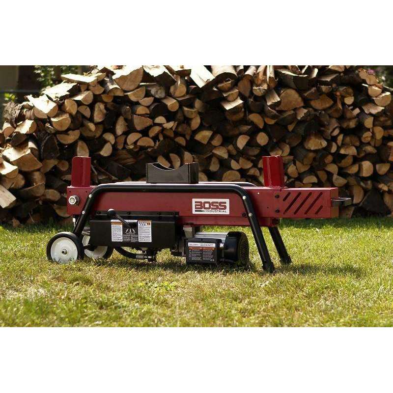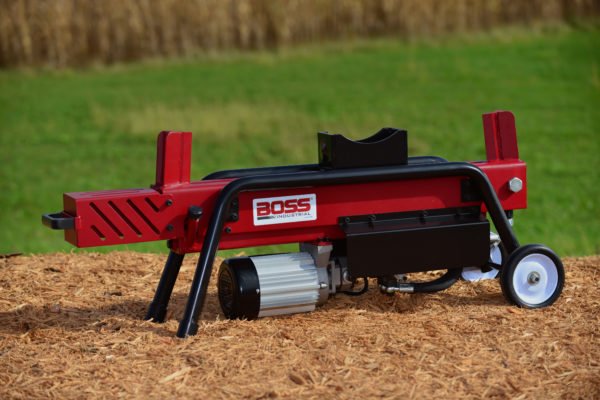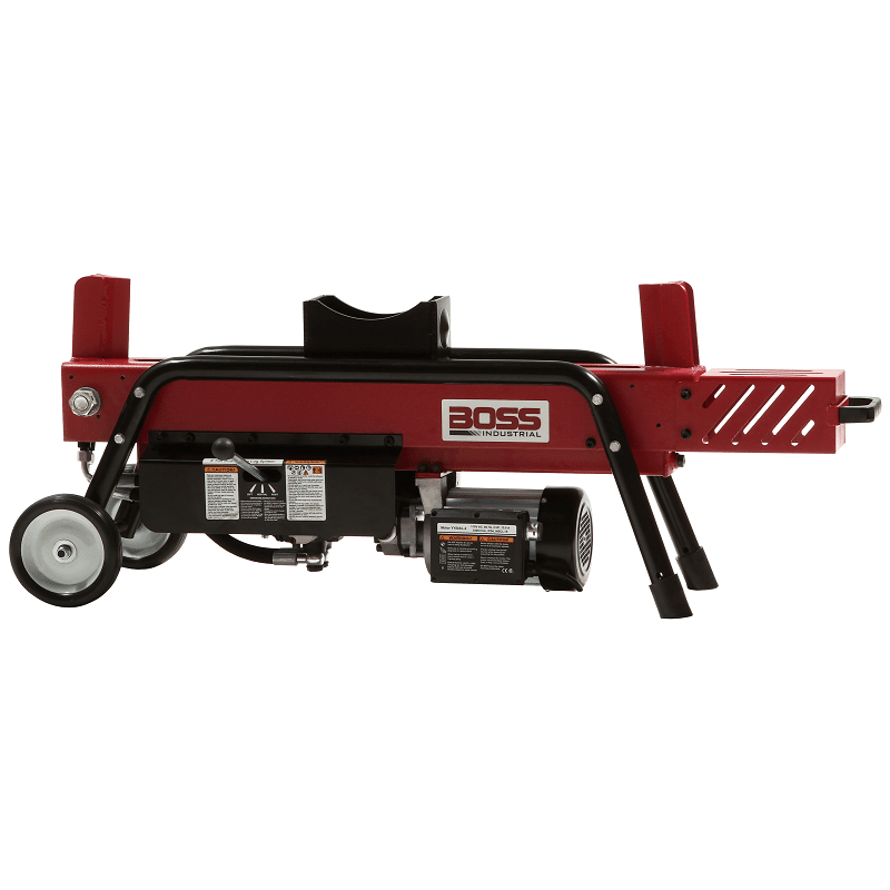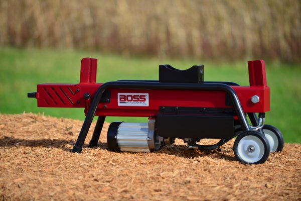 The Boss Industrial dual action ED8T20 electric wood splitter has two 5 inch wedges and a length capacity of 20.5″. No waiting for return of the hydraulic ram, just put in another log and split back the other way.