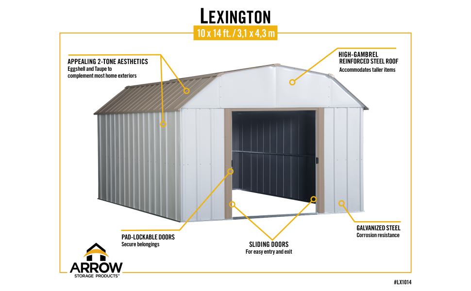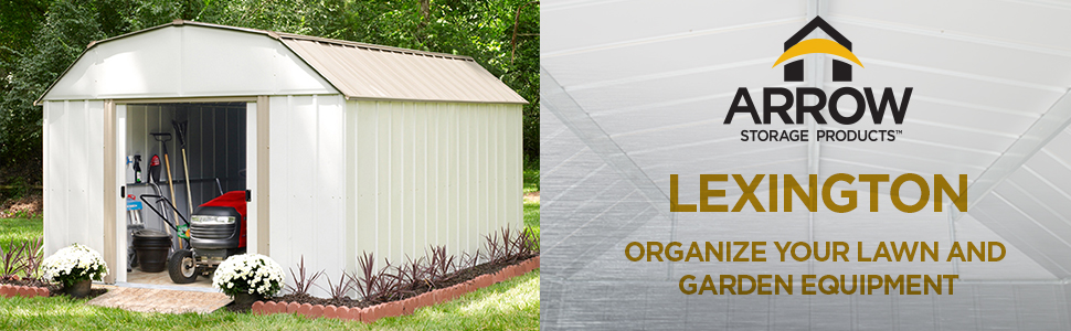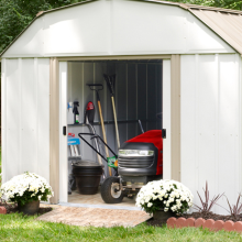 The shed has a has a baked-on enamel finish in eggshell and taupe to complement home exteriors.