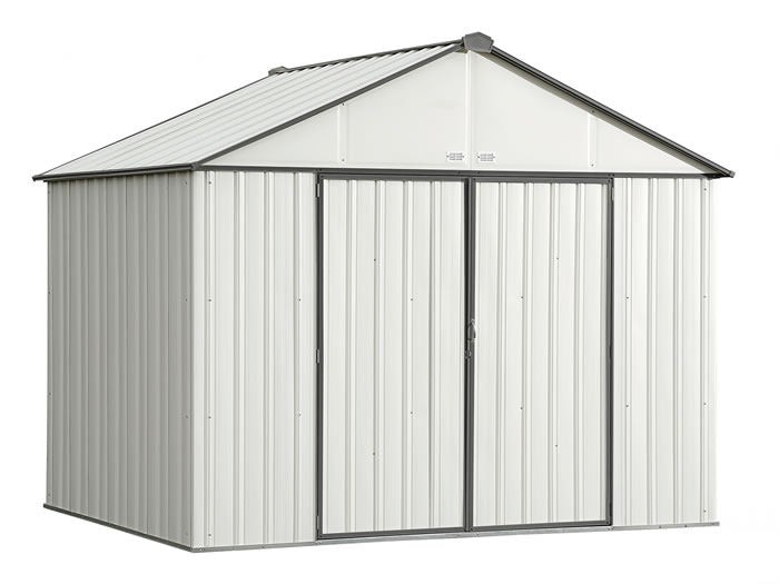 Introducing the EZEE Shed from Arrow Storage Products a shed that builds in half the time. The EZEE Shed is a galvanized steel shed that is durable and made to last. It features the revolutionary Snap-IT Quick Assembly system that cuts assembly time down by 50% compared to most steel sheds on the market today. The EZEE Shed has a reduced number of fasteners across walls, roof, and doors so assembly is faster and easier! The EZEE Shed features a design that is 2x stronger than leading steel sheds on the market. Its unique panel geometry is more impact resistant, and with its overlapping Snap-IT panels that connect every 12 in., it boasts a stronger overall building design. The EZEE Shed also features improved roof assembly that allows for ground assembly of the roof for easier and faster roof attachment. The EZEE Shed is not only a tougher shed with faster assembly, it’s a more modern and attractive take on outdoor storage sheds, too! The EZEE Shed is available in an updated color pallet that makes it a modern and stylish storage solution for backyard, patio, and garden areas. The EZEE Shed doesn’t just look better; it offers better storage space, as well. The EZEE Shed’s attractive swing door design allows for easier access to your items and features a heavy duty framed out design. The doors are set on 3 hinges for extra durability. The EZEE Shed is a strong and modern alternative to your standard backyard shed, and the next step up in steel shed assembly and design.