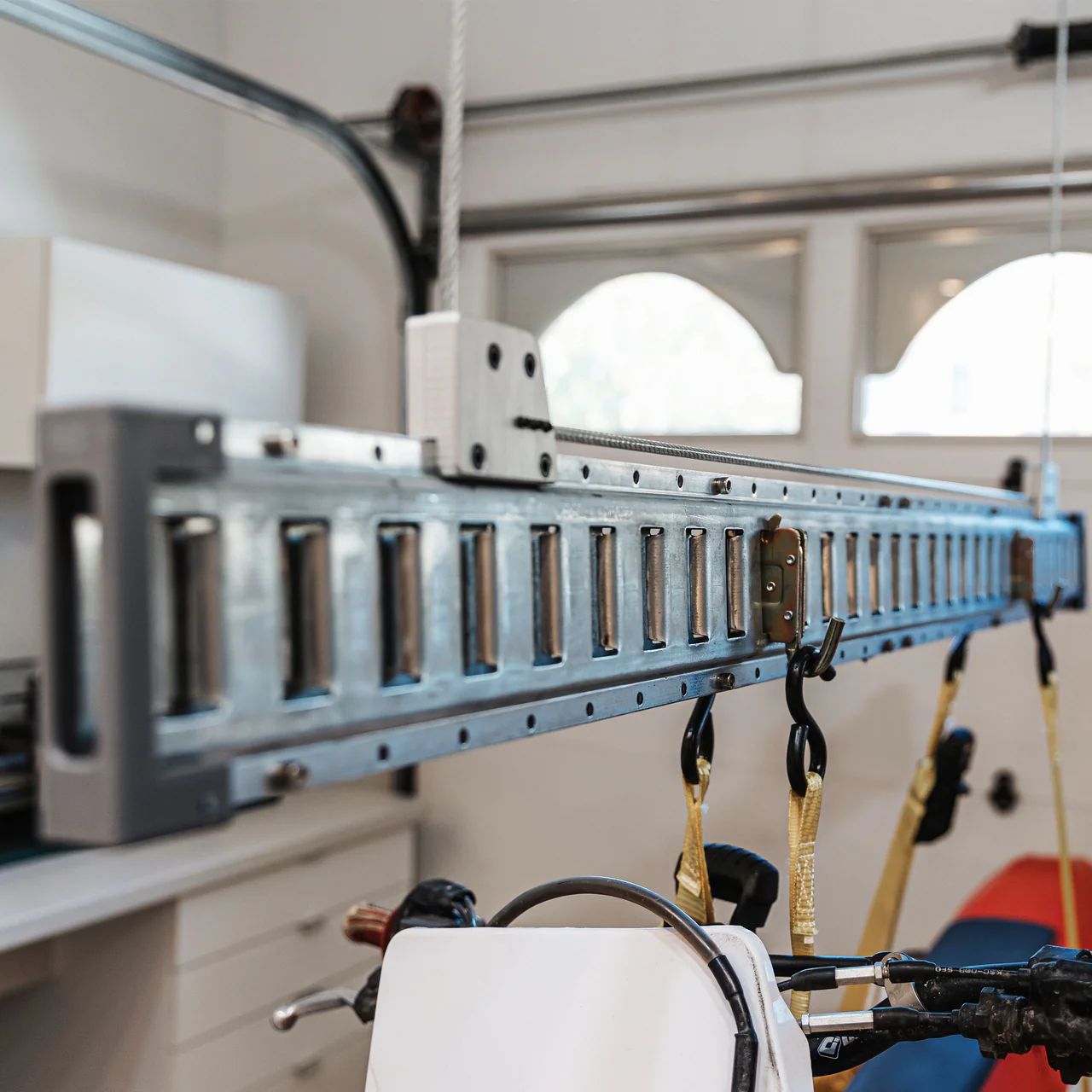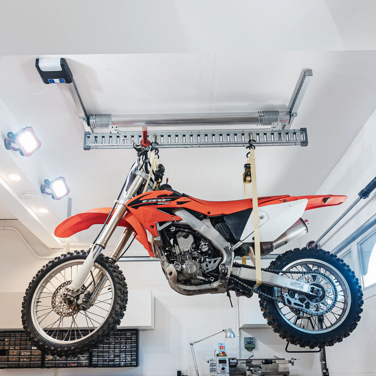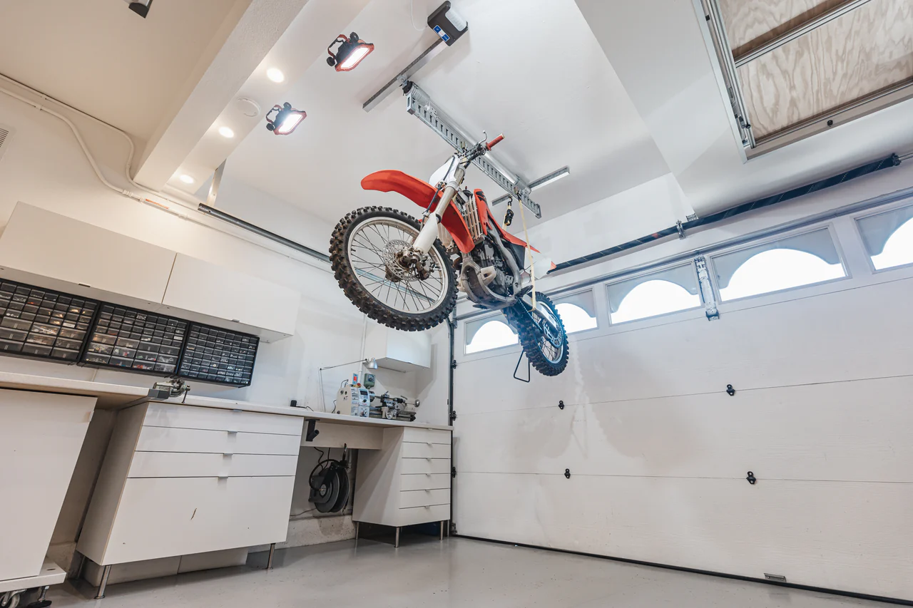 Our single motor lifter is the ideal storage solution for a wide variety of heavy, bulky items like Truck Tops, Jeep Tops, Rooftop Tents, Canoes, Kayaks, Fifth Wheel Hitch, Bikes, and many more. Thanks to our powerful motor with a 400 lbs lifting capacity. All controlled via our wireless remote control.