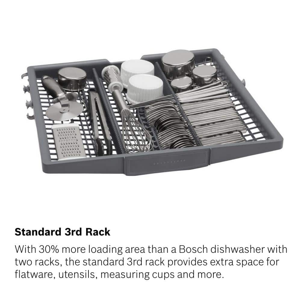 With 30% more loading area than a Bosch dishwasher with two racks, the standard 3rd rack provides extra space for flatware, utensils, measuring cups and more.