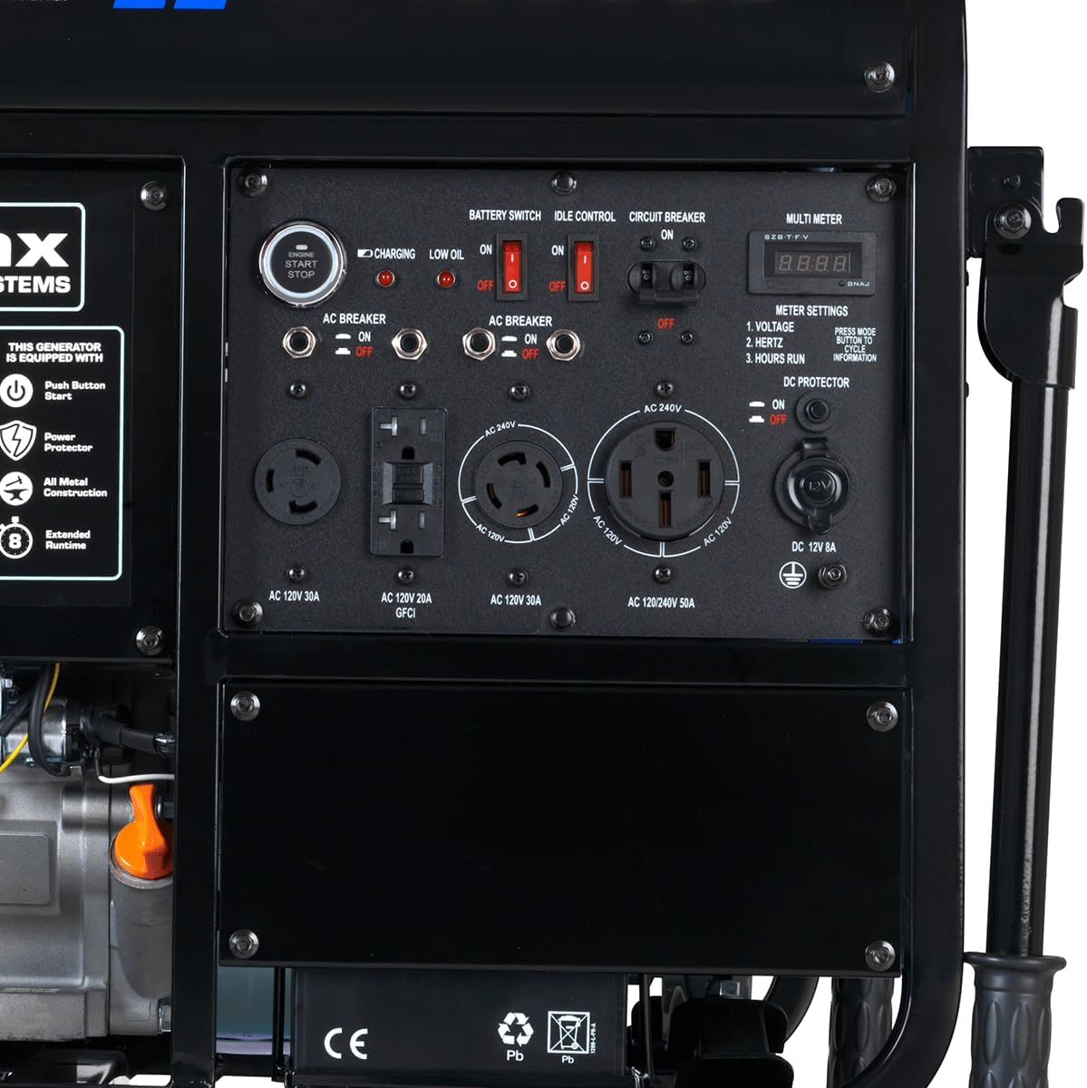 At the heart of the XP13000EH is a durable 500cc DuroMax OHV engine, engineered for long-lasting power and built to perform under the toughest conditions. Its user-friendly push-button electric start and front-facing control panel make switching between gasoline and propane quick and effortless.
