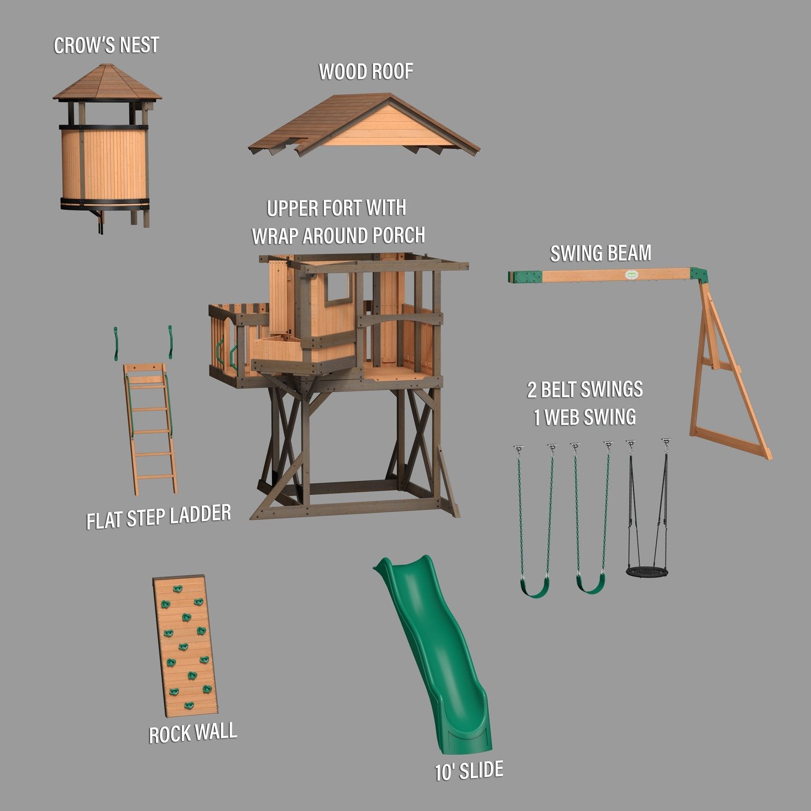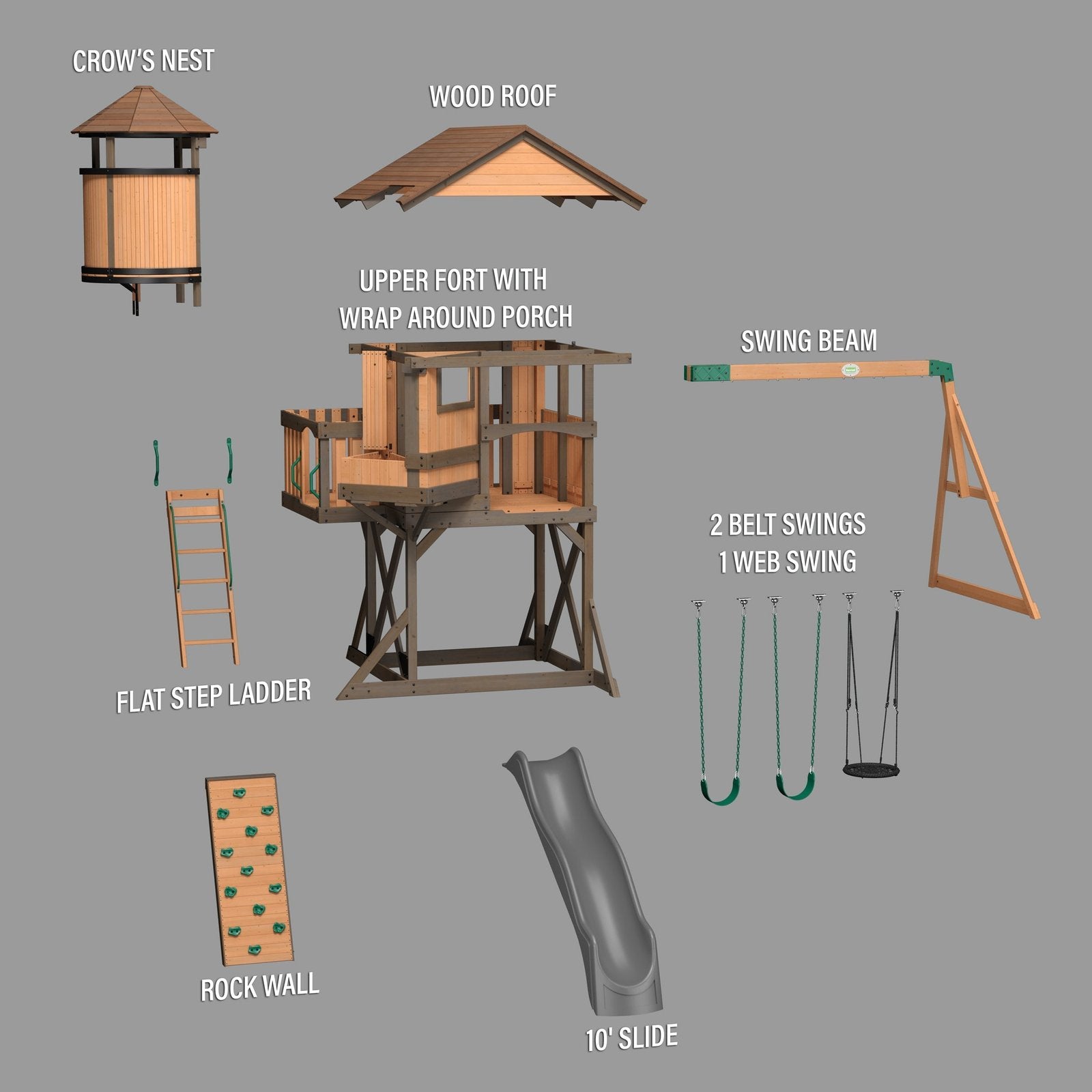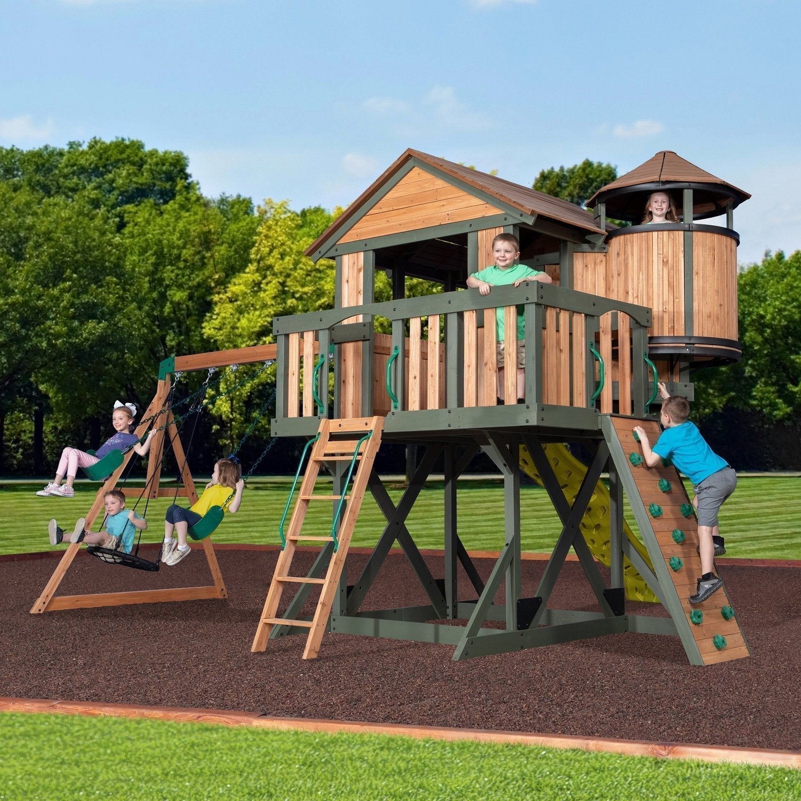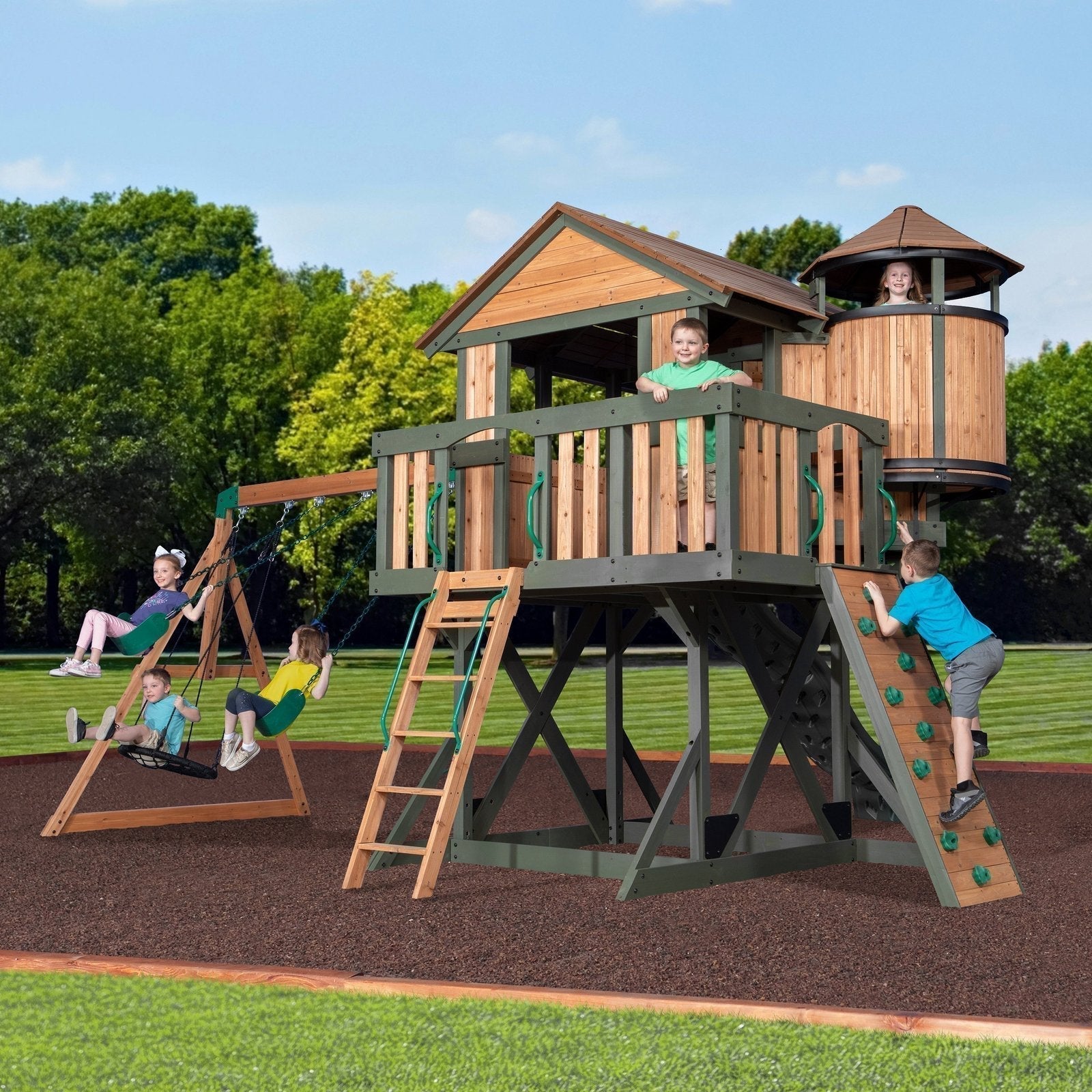 With one of the tallest and most spacious clubhouses available, it’s the perfect combination of playhouse and swing set. Get ready to see smiling faces climbing the rock wall, hanging out in the crow’s nest, and spending hours and hours having fun outside.