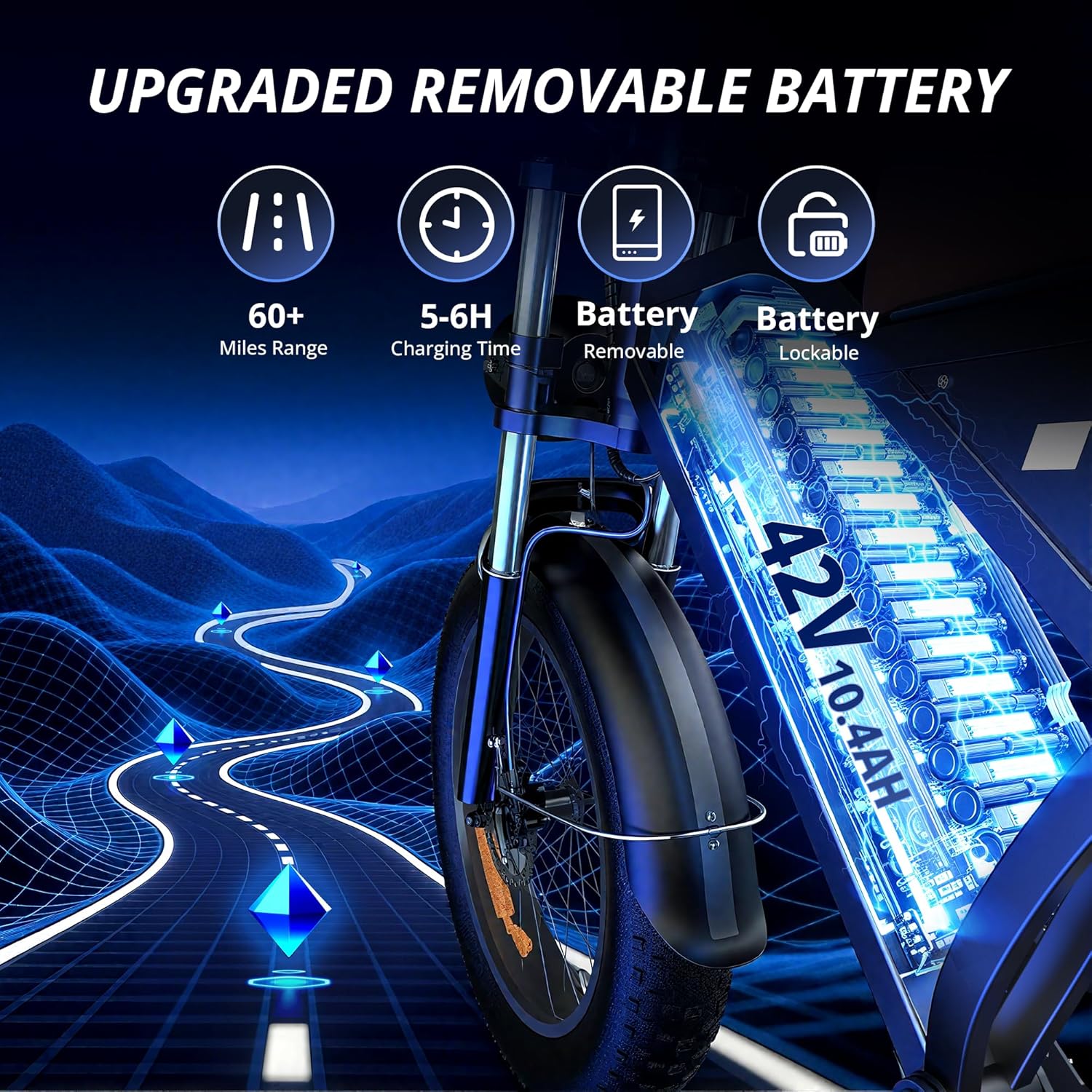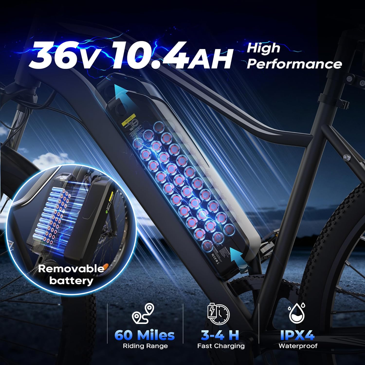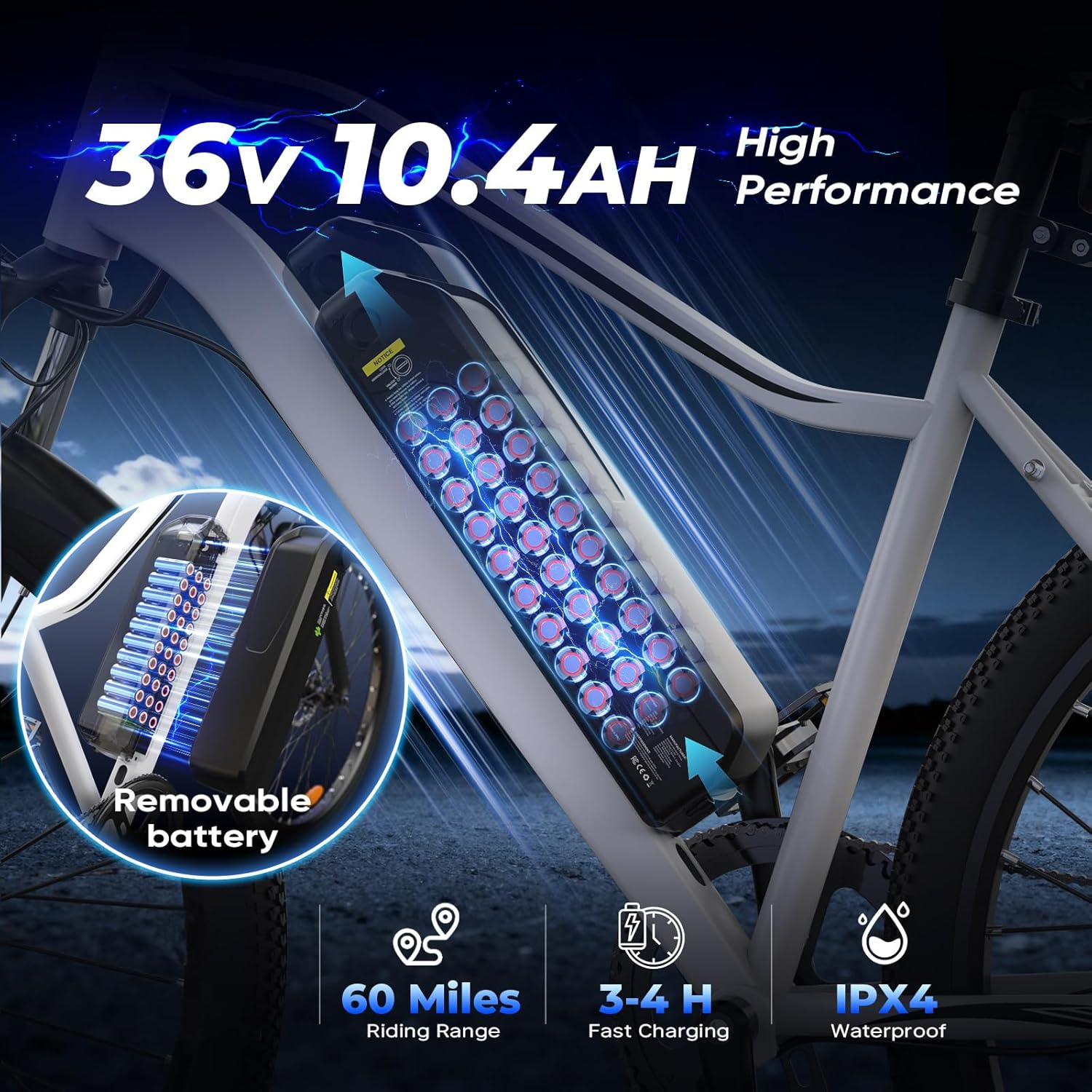 Removable High-Capacity Battery: Equipped with a 36V 10.4Ah lithium battery, this electric bike offers up to 43 miles per charge. Charge easily on or off the bike in just 3–4 hours. Comes with a secure key lock system to keep the battery safe during parking or transport.
