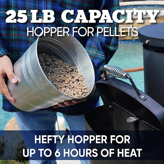 • Efficient Pellet Fuel System: 25 lb. gravity-fed hopper allows for 5 hours on high and 7 hours on low.