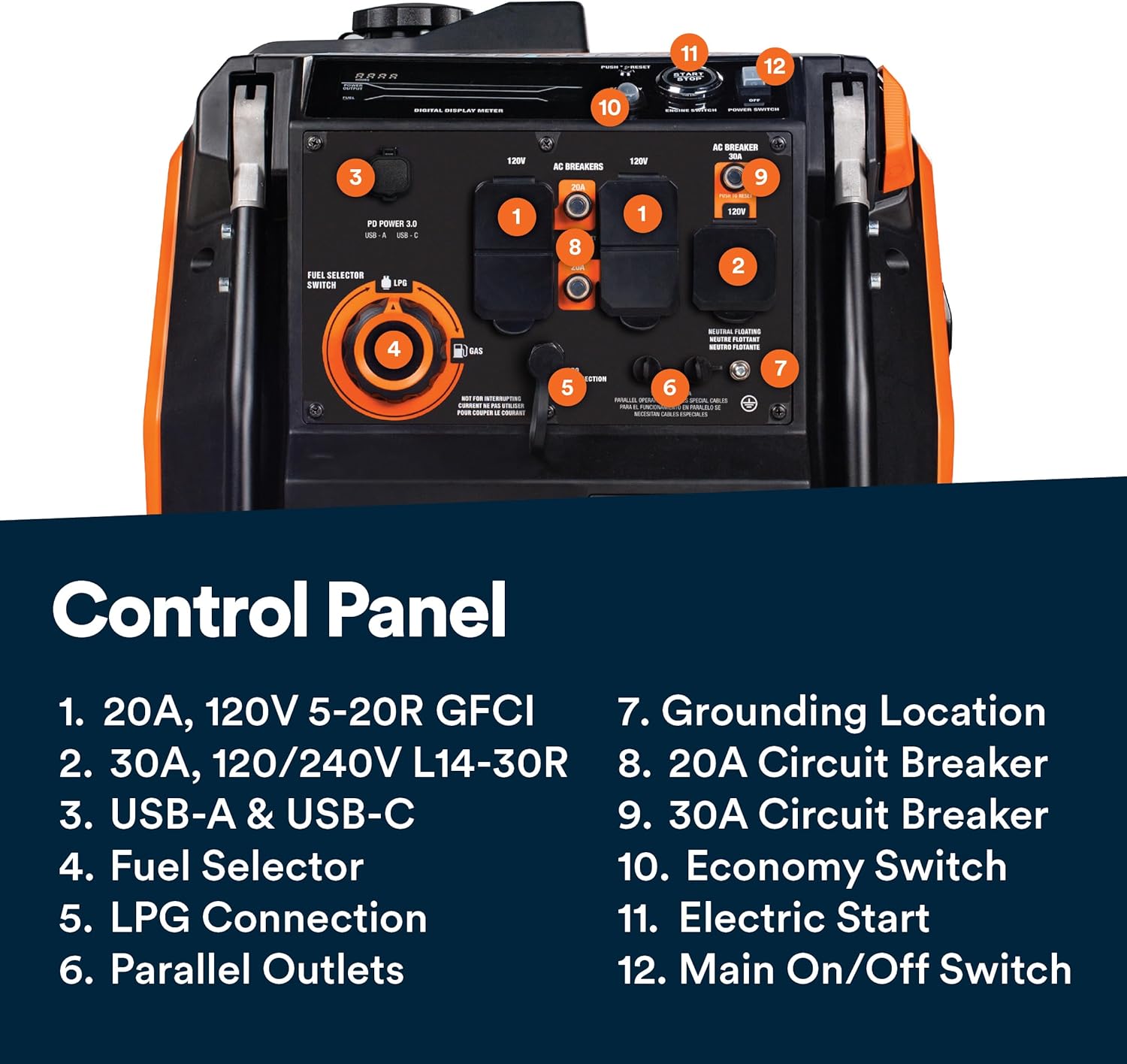Versatile Connectivity – Includes duplex 120V outlets, 30A twist-lock outlet, and USB ports for charging multiple devices.