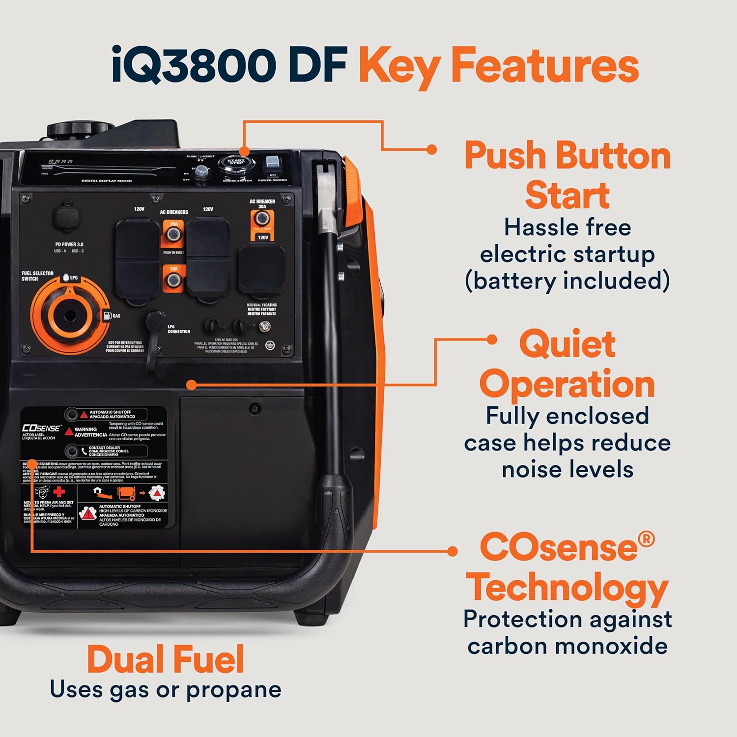 Smart Safety Features – COsense® Technology protects against carbon monoxide hazards, and LED indicators alert for low oil, overload, and ready-to-use status.