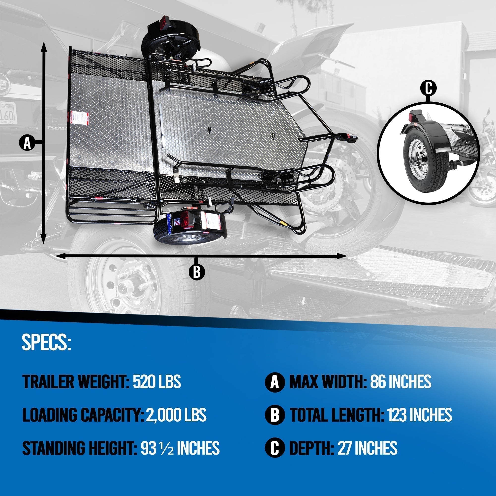The Go! Series Dual Ride-Up Folding Motorcycle Trailer combines ride-on convenience and safety with a lightweight, user-friendly, space-saving design. Designed for bikes and cargo of all sizes and riders of all styles, this trailer can handle it all without breaking the bank.