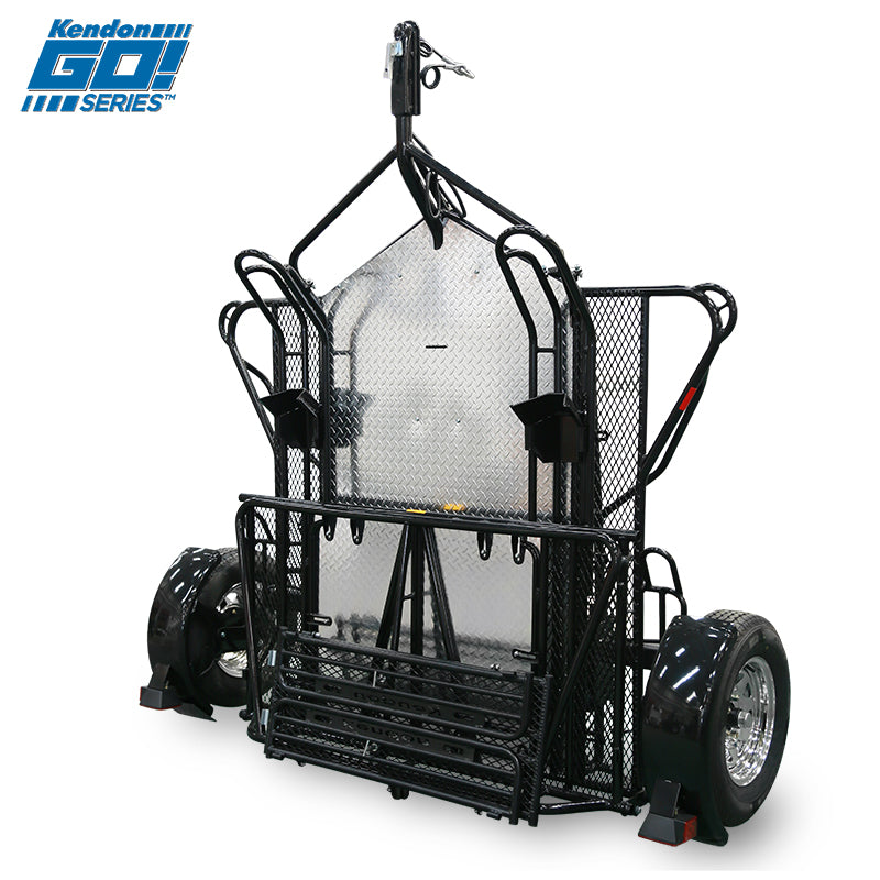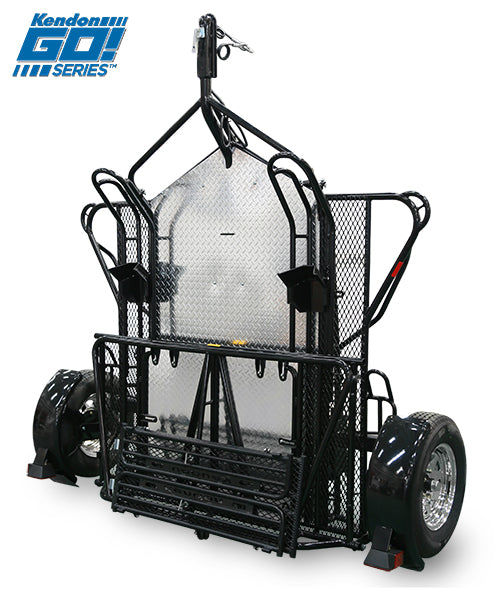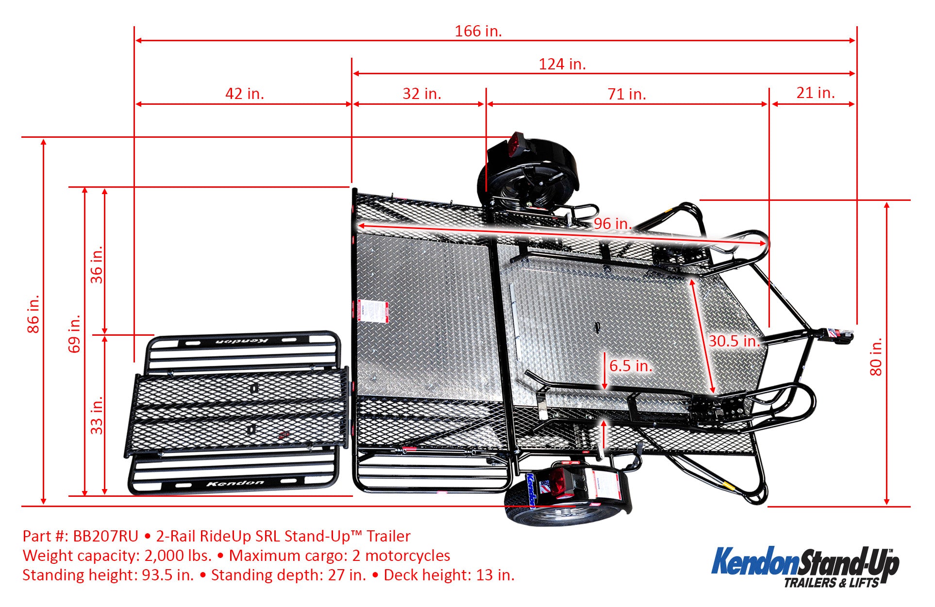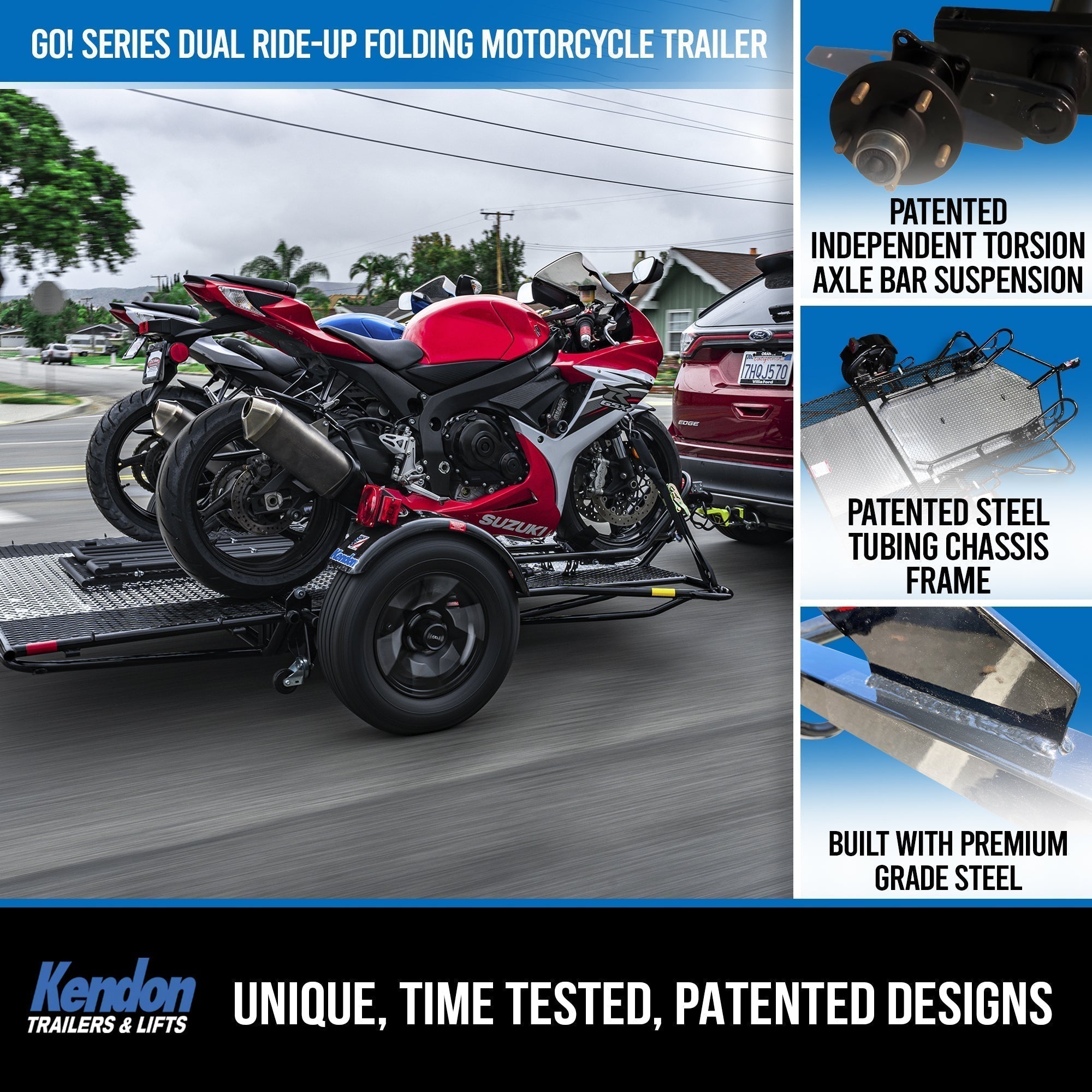 Go! Series Dual motorcycle trailers combine the industry leading design and engineering qualities of our flagship Dual Ride-Up Motorcycle Trailers with more value-oriented materials and features to create the perfect combination of a fully functional cost-effective folding motorcycle trailer. The Go! Series Dual-Rail Ride-Up trailer can carry up to two full-size motorcycles, and/or cargo, and is equipped with ride-on capabilities plus Kendon’s renowned Stand-Up™ folding feature. When in storage, the Dual-Rail Ride-Up takes up about the same space as a standard bedroom dresser or chest of drawers.