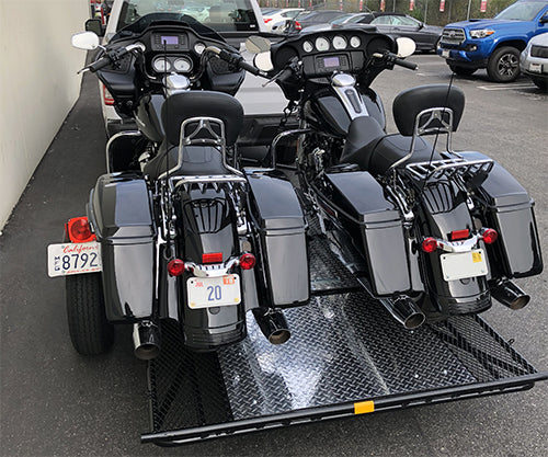 Our Ride-Up models feature wider loading ramps, wider rear sections, and foot extensions to provide safe foot placement as you ride the bike onto or back the bike off of the trailer. The folding ramp on the dual motorcycle trailer can be stored on the trailer while towing and while folded for storage.
