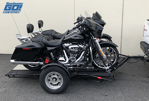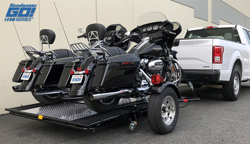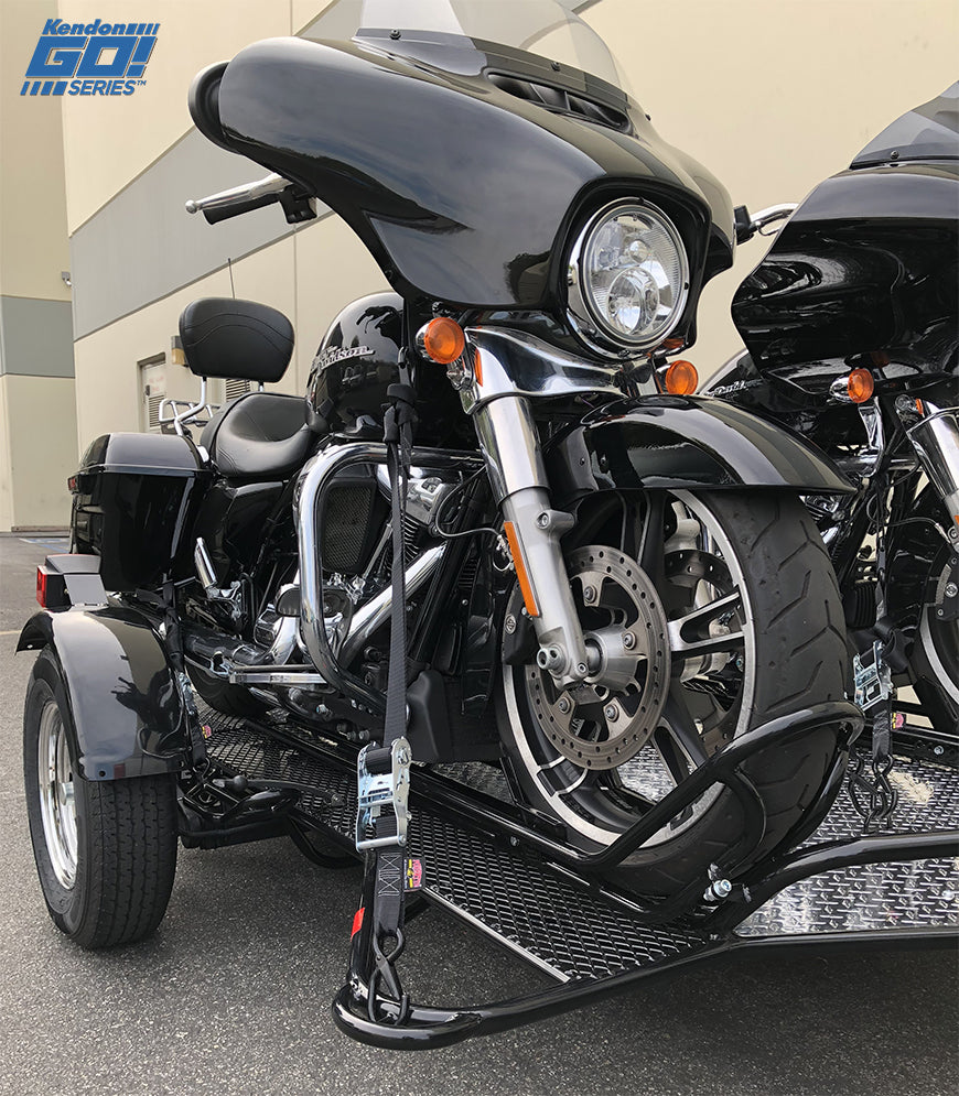 Just like our hand-crafted Dual Ride-Up SRL Trailer, the Go! Series two bike trailer features durable light-weight frame geometry and suspension design that allows you to ride your bike onto the trailer. The ride-on operation makes it much easier to load heavy, full-size bikes. The included frame extensions allow you to put your feet down safely throughout the loading and unloading of your motorcycle. When the bike is loaded, the Kendon classic rail and wheel chock system keeps your bike upright so you can strap down the bike for safe and easy towing.