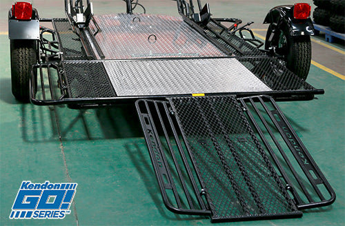 The Kendon Go! Dual-Rail trailer features a 5′ x 7′ expanded metal and diamond plate deck area designed to hold up to two full-size motorcycles such as Harley-Davidsons, GoldWings, K1600s, adventure bikes, etc. The heavy-duty independent torsion-bar axle and hub combination give the Dual-Rail Go! bike trailer its true 2,000-lbs. carrying capacity. The independent torsion axle allows for towing one bike on either side of the trailer while maintaining perfect balance. Not looking to tow a bike? No problem. This folding motorcycle trailer has removable rails so you can load practically anything that can be safely tied down on the flat deck area of the trailer.