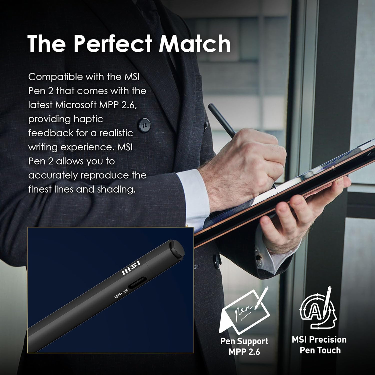 MSI Pen 2 Support: Features MPP 2.6 technology with haptic feedback for realistic pen touch, plus quick 5-minute charging for up to 10 hours of usage via USB-C.