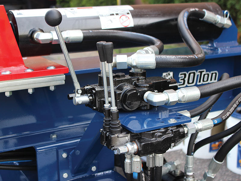 Included with this log splitter is a hydraulic lift, and hydraulic adjustable 4 way wedge (4 way adjusts up 7″ high). The high carbon steel wedge is 12″ high and 20″ wide! This unit has two dedicated hydraulic pumps. The 22GPM pump controls the ram only so no speed is sacrificed. The second pump is dedicated to the hydraulic lift arm and 4 way wedge.