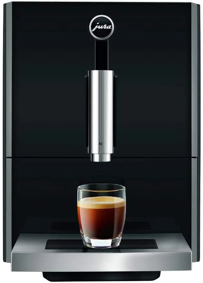 Wake up with a hot cup of espresso made with the Jura A1 Espresso Machine. This beautiful, quality coffee, espresso, and ristretto maker comes in a Piano Black color and is designed with sleek clean lines. The top side has a visible bean container and an intuitive symbol control panel to make your morning shot of espresso simple to make. You’ll get a consistently delicious drink with the thermoblock heating system with 15 bar pump, and you can choose between two levels of coffee strength. This machine comes with an Aroma grinder and CLEARYL Blue filter for the high quality cup of coffee that you expect from Jura. An auto shut off program is included in the machine for your safety. Whether you crave a shot of ristretto or a cup of coffee, the coffee spout adjusts to your needs from 2. 3 to 5. 5 inches. For your convenience, the A1 has a self cleaning option that will remind you after 180 preparations or 80 switch-on rinses when it needs to run so you don’t have to worry. 17-1/2″ L x 9-1/2″ W x 12-3/4″ H, with a 37 ounce water capacity; 4. 4 ounce bean container; 9 serving ground container