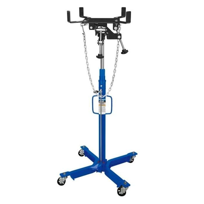 The K Tool Telescoping Manual Transmission Jack features a single-stage telescopic design for maximum height. The large base provides balance while in use and helps increase safety. Convenient release foot pedal allows for smooth operation and ease of control while lowering transmissions. Multi-position saddle adjusts to multiple angles. Safety chains secure the workload to prevent injury.