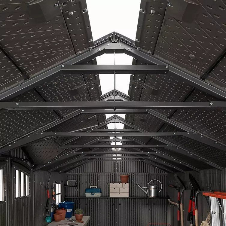 • Welcome to the next generation of Lifetime storage sheds! Introducing the Lifetime 15×8 dual entry shed with the great looking wood textured rough cut design. With all the superior materials and qualities Lifetime sheds are known for, this shed will be sure to serve you for many years. This building is constructed with dual-wall high-density polyethylene (HDPE) panels combined with five heavy duty Steel A-frame trusses to give it unmatched stregnth against the toughest elements. Panels are UV protected to give you unfading great looks and protect from cracking. The shed is stain resistant and never needs painting! Your no maintenance storage solution. Inside you’ll find high impact plastic flooring with hardwood texture looks. The floor is resistant to oil and other stains and is textured for prevent slips and falls (foundation of concrete or wood decking required). You’ll be able to get organized the first day with the included shelving and wall hooks. Natural lighting from 6 included skylights, 2 windows and transom windows on the doors will help you see clearly while working inside. Two screened vents above each gable end provides fresh air and ventilation while keeping pests out. Two swing open doors give you easy access to your stored items. Doors are pad lockable for security (pad locks not included). This extra large shed is a great option for storing riding mowers, atv’s, motorcycles, bicycles, kayaks, toys and more! You’re search is over, if this shed meets your needs and budget you are in the right place!The Lifetime 15′ x 8′ Rough Cut Shed has two sets of double doors (front and side) and features: (5) A-frame heavy duty steel trusses, (6) small skylights, (2) shatter-proof polycarbonate windows with shutters, (2) screened vents, (12) wall hooks, (1) 90″ x 9″ shelf, (2) corner shelves, and a 10-year limited warranty. Floor and installation hardware included. Comes in (3) boxes. *foundation by homeowner