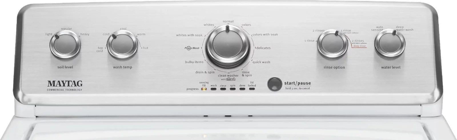 Simplify laundry day with this Maytag top-loading washer. Its 3.8 cu. ft. capacity is large enough to handle everything in your hamper, and its PowerWash agitator cleans loads efficiently to eliminate stains. This Maytag top-loading washer has an Auto Sensing function for automatic adjustment of the water level, and its Quick Wash cycle helps you save time.