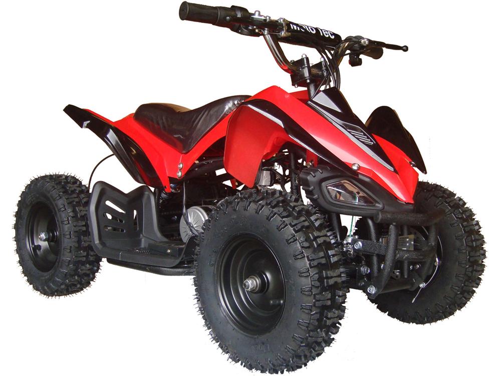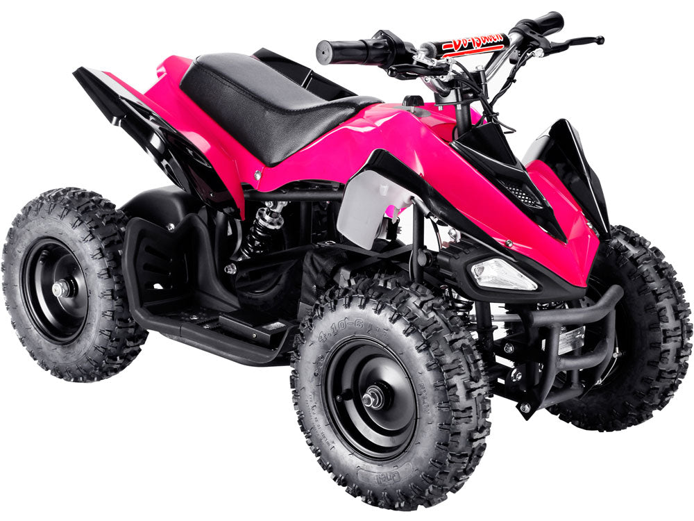 The MotoTec 24v Mini Quad v2 is the ultimate kids atv! Great for driveway and backyard fun, cruise over bumps and speed through dirt trails with ease. Comes standard with front & rear suspension, front & rear brakes and large 13 inch knobby pneumatic tires. This mini quad provides longer ride times than the competition with TWO large 12v 12amp hour batteries. New features include: headlight, key start, battery meter, forward & reverse, 2 speeds selectable by key and twist throttle with safety foot switch.