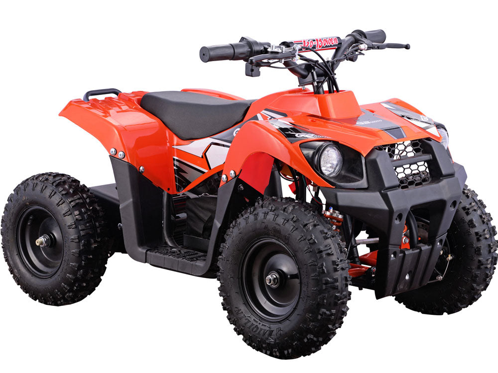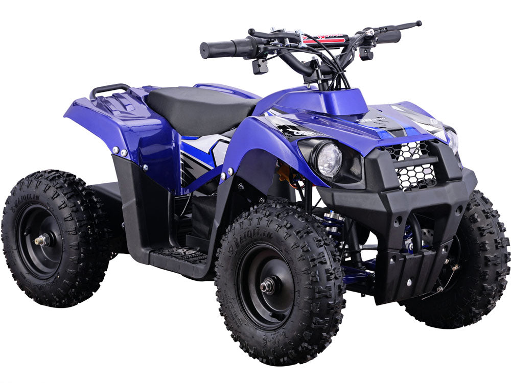 The MotoTec 36v Mini Quad Monster v6 is the ultimate kids atv! Great for driveway and backyard fun, cruise over bumps and speed through dirt trails with ease. Comes standard with front & rear suspension, front & rear brakes and large 13 inch knobby pneumatic tires. This mini quad provides longer ride times than the competition with THREE large 12v 12amp hour batteries. New features include: headlight, key start, battery meter, forward & reverse, 2 speeds selectable by key and twist throttle with safety foot switch.