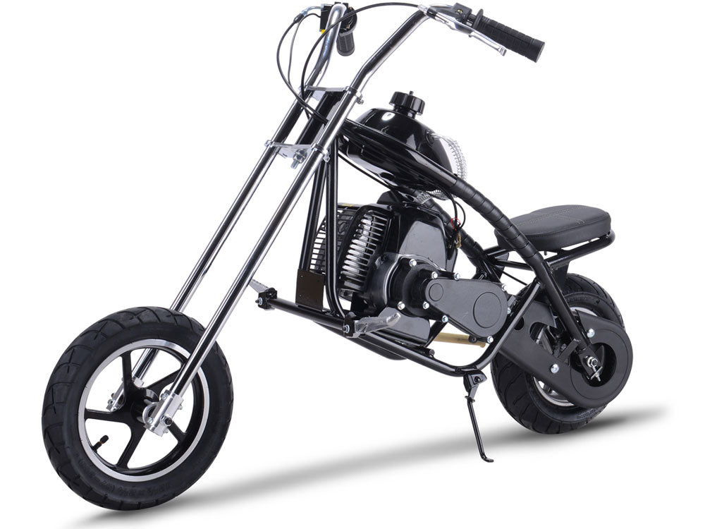 The MotoTec 49cc Gas Mini Chopper is the ultimate kid ride! Great for driveway and parking lot fun, cruise around cones and speed through trails with ease. Comes standard with rear disc brakes and large 14 inch front and 11 inch rear pneumatic street tires.