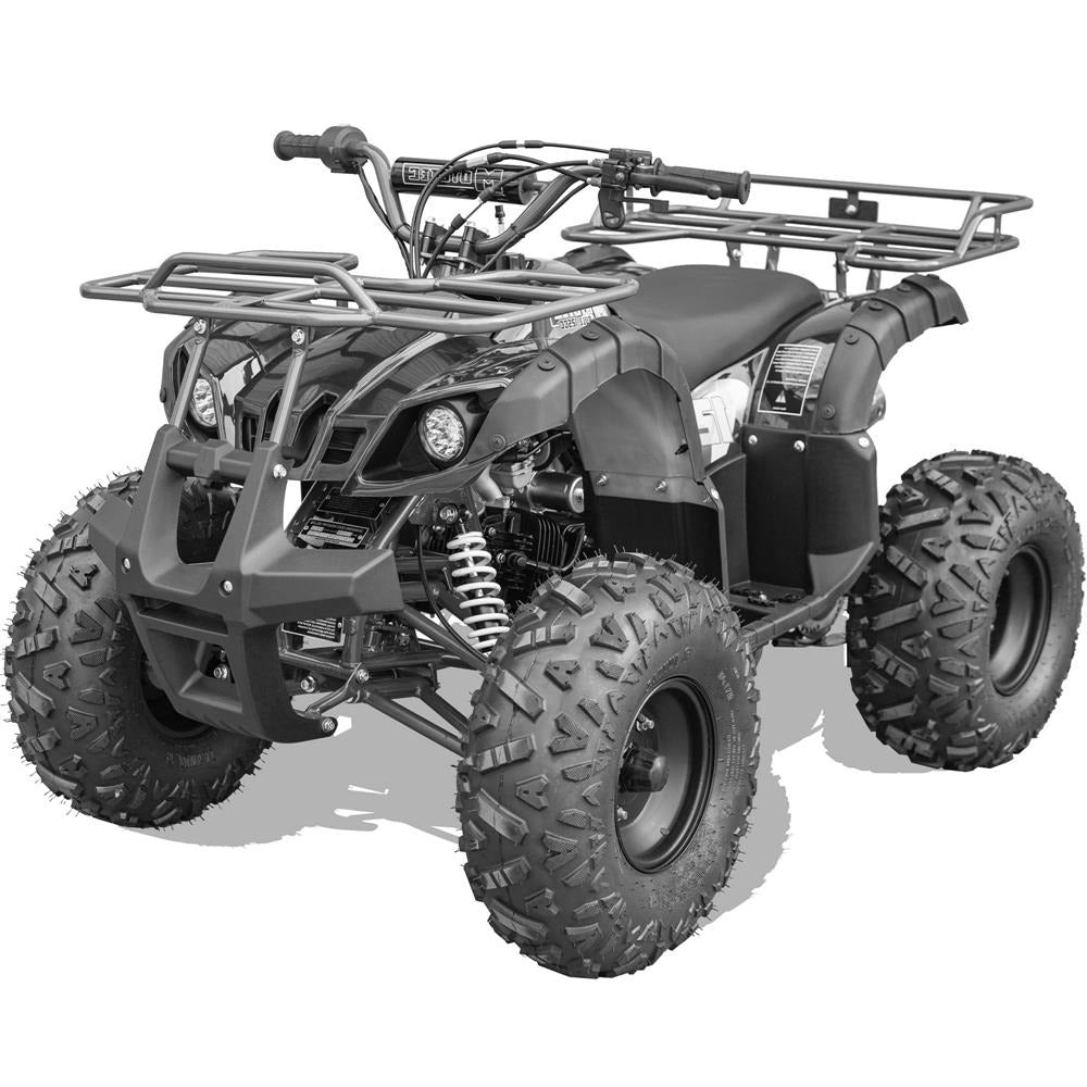 Introducing the new MotoTec Bull 125cc 4-stroke Kids Gas Powered ATV with Reverse and Electric Start, this beast is ready to tackle any off-road terrain for beginner to intermediate riders. Push the thumb throttle and listing to the engine sing with 8 horse power for maximum entertainment. This 4-wheeler can carry up to 220 lbs and recommended for 10+ years old. Comes standard with self-adjusting rugged chain drive, front drum and hydraulic rear brakes, adjustable handlebars, front and rear suspension, large air-filled tires and a 4-stroke 125cc engine. Now featuring a parent remote control kill switch for safety. Don’t wait, the thrill of trail riding awaits.