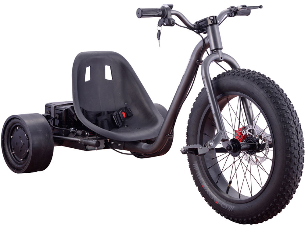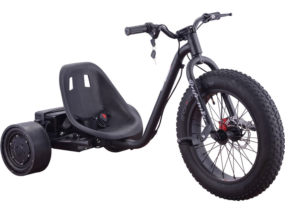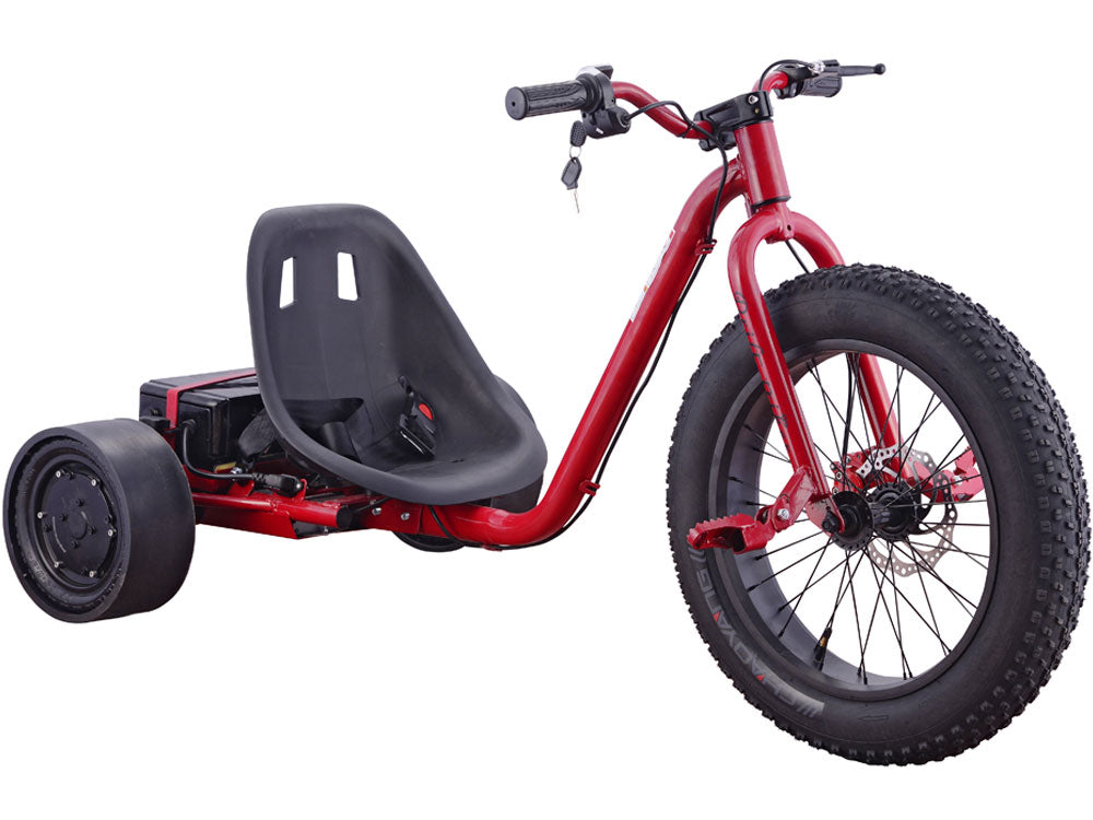 The New MotoTec DT900 Motorized Drift Trike delivers high power and speeds for the ultimate drifting ride. Powered by 2 hub motors in the rear wheels, 3 large 12v 12ah batteries and reaches speeds of 15 mph. Features include: large front tire, battery meter, key start, twist throttle, front disk brake, a bucket seat and easily changeable plastic disks around the rear tires. Featuring foot pegs pedals!