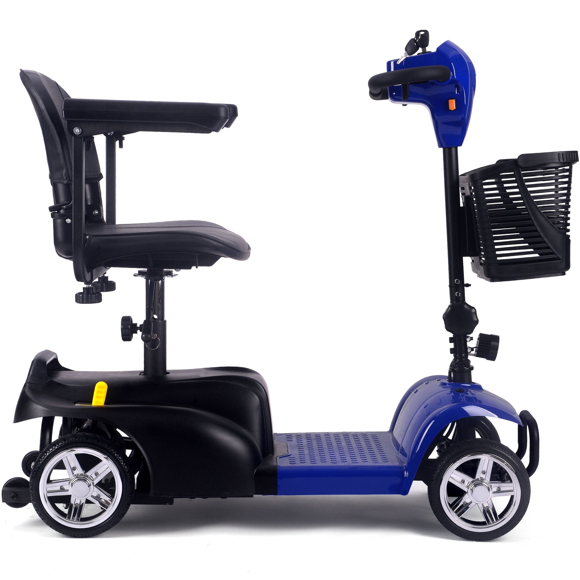 The MotoTec 24v 250w folding mobility scooter features a high efficiency motor, adjustable seat and handlebar positions, wear-resistant tires, simple control panel, anti-collision front bar, wheelie bars, manual push option, all terrain and lightweight, foldable for easy transport, removeable front carry basket and long 15 mile range with 6mph top speed.