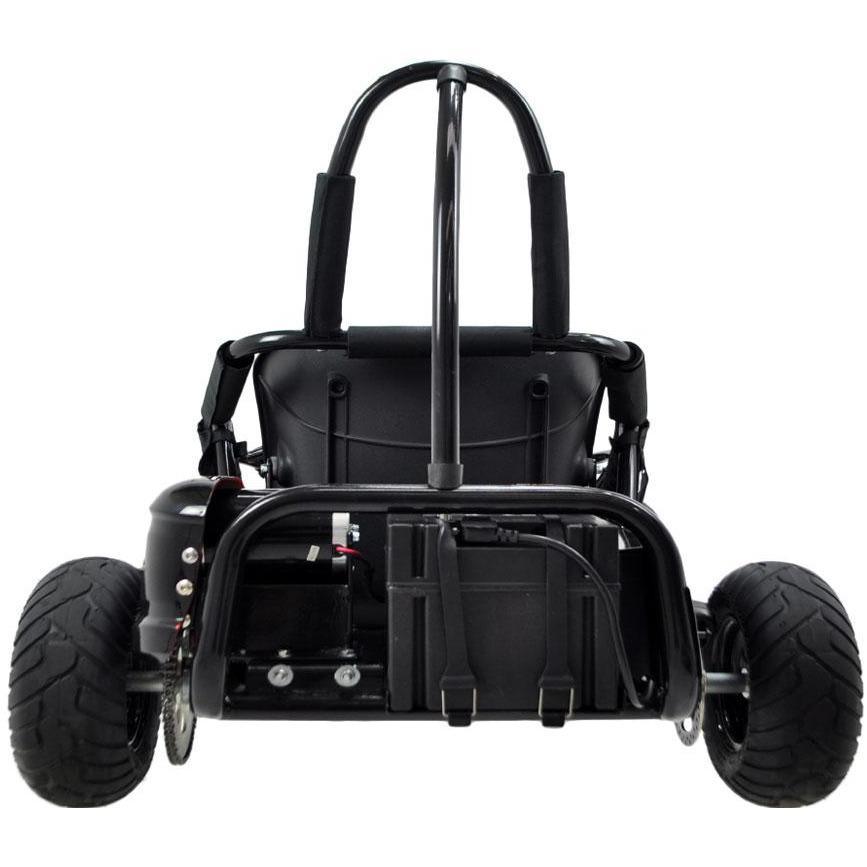 This is a powerful electric go kart! The MotoTec Off Road Electric Kart has a powerful 1,000-watt brushless electric motor that gives it incredible power and acceleration. It has top speed selections of 10 mph, 15 mph, and 20 mph, so you can choose the speed appropriate for the road. The motor is connected to the rear wheel with a chain that multiplies the torque for better acceleration. Like a true go kart, it features a positraction (limited slip differential) for faster cornering.