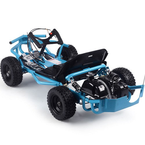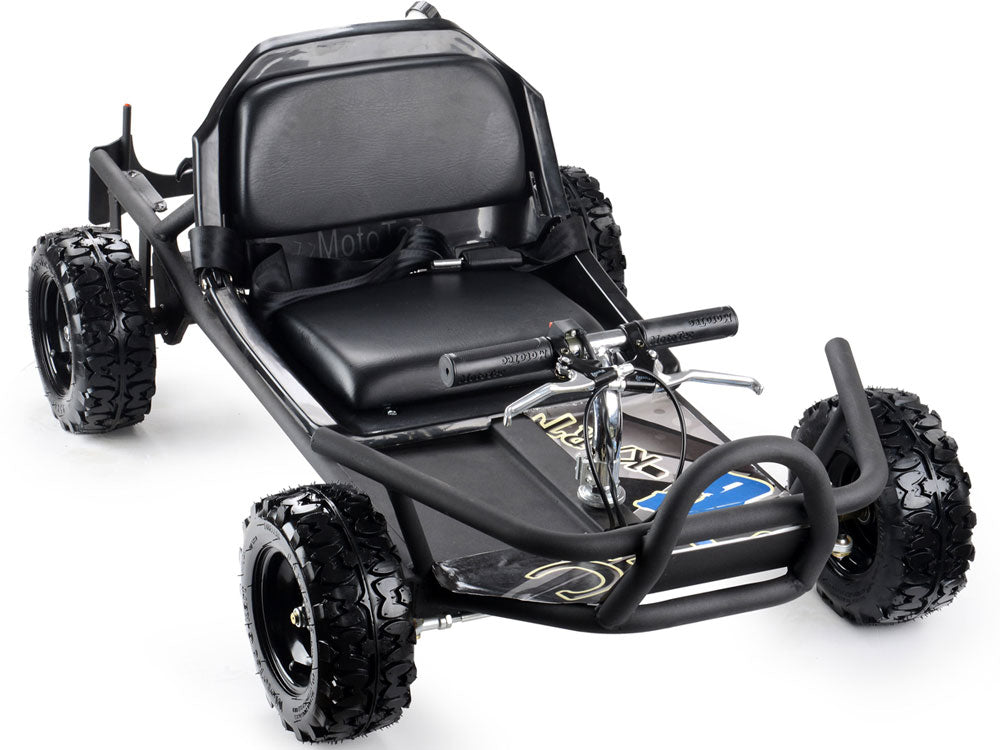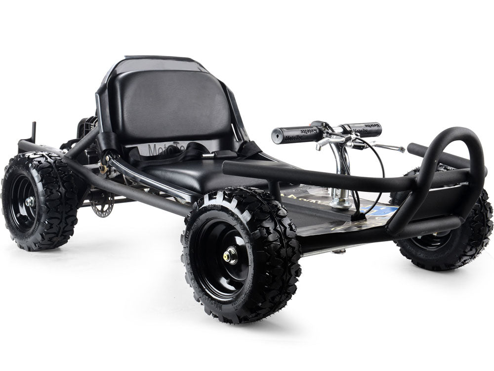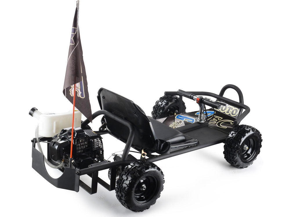 The MotoTec Sandman 49cc Go Kart! Great for on-road/off-road riding. Built tough with front and rear bumpers, 9 inch ground clearance and direct chain drive for higher top speeds. Comes standard with 8 inch knobby tires, powerful axle-mounted vented rear disc brake, high-tensile frame and speeds up to a high mph. This go-kart is great for kids and adults. Ride at your own risk and always wear protective gear.