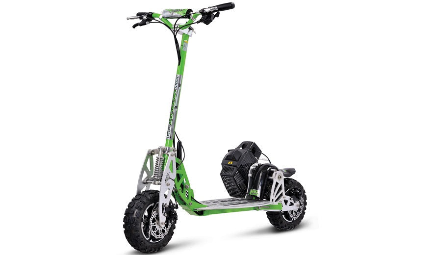 The MotoTec UberScoot Evo-70x_Green Speed Gas Scooter X uses newly developed cross tread stability tires, the patented 2-speed gearbox and the auto locking fold up/fold down design, making it as easy to maintain as it is to ride for any novice or veteran adventurer.