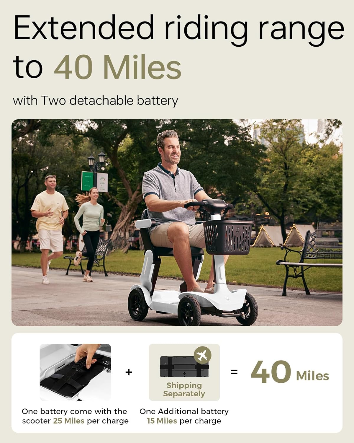 Extended Range & Dual Battery: Up to 40 miles per charge with two powerful detachable lithium batteries. Additional battery is airline-approved, perfect for travel.