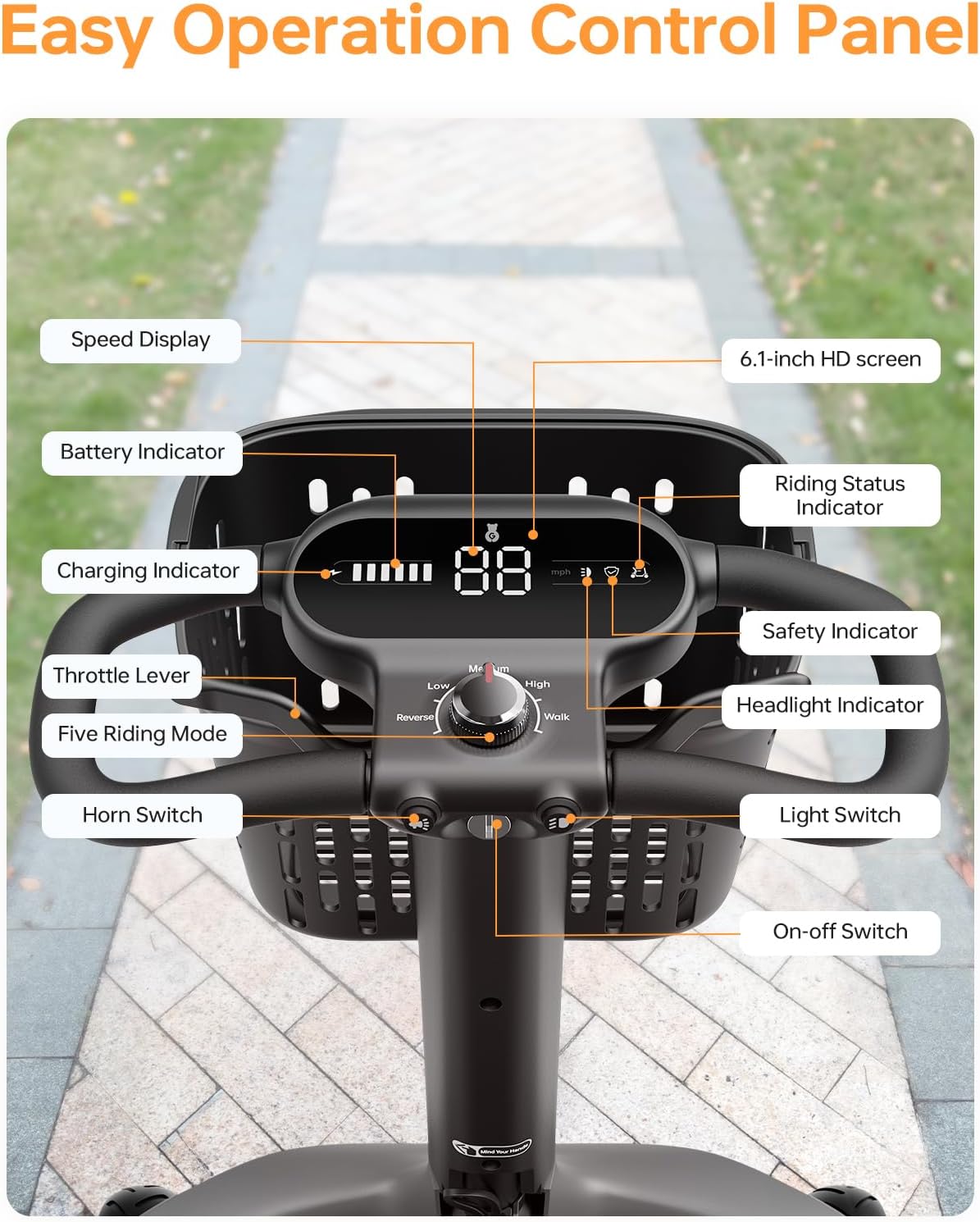 Customizable Comfort: 6.1-inch HD display shows battery, speed, and lights. Adjustable tiller, foldable/expandable armrests, and thick cushioned seat provide ergonomic, long-distance comfort.