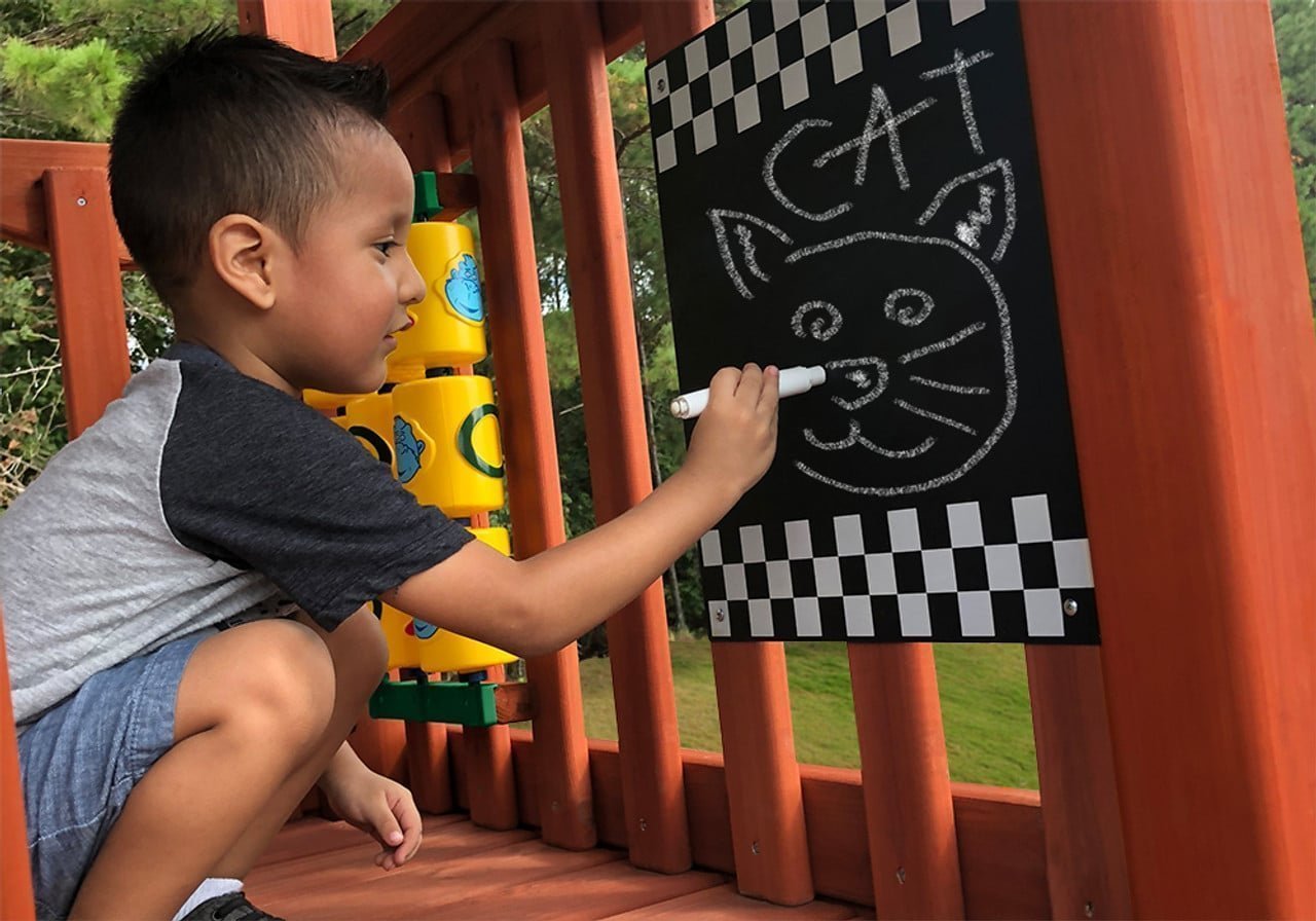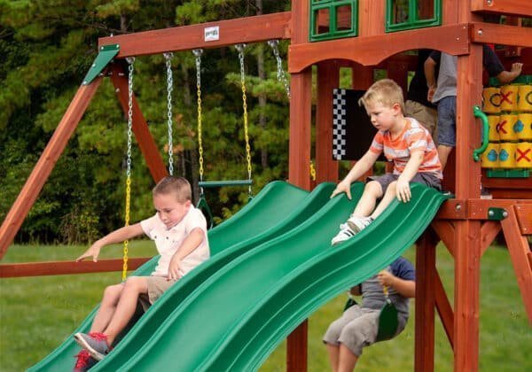 Boredom has now become a thing of the past with our PlayMaker Deluxe™ swing set. With the Rope & Rock Wall, Twin Alpine Slides and a load of fun accessories like a Chalkboard and a Play Periscope, the good times and great memories are here to stay!