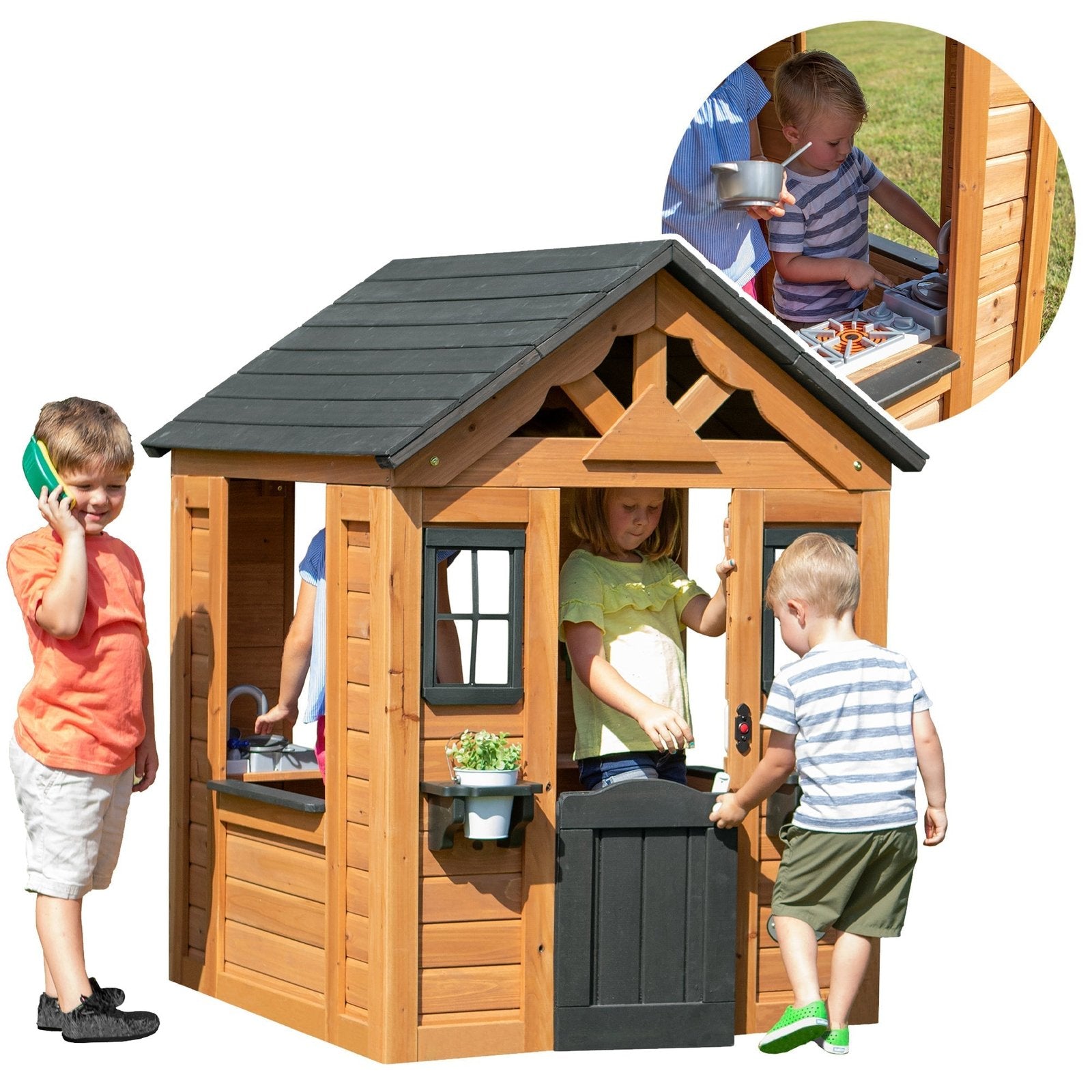 A cheery half-door is perfect for mini greeters, thirsts can be quenched through the side snack window, and the front boasts adorable flower pot holders (blossoms sold separately). Inside, the fun sizzles with a play sink, stove, and cordless phone.