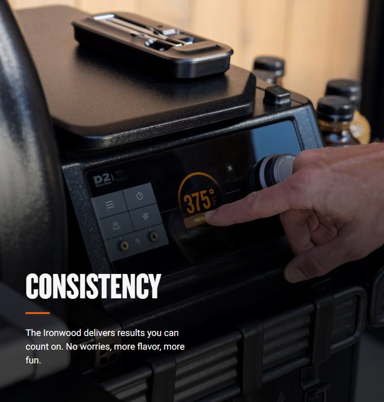 The all-new Ironwood® Pellet Grill is here to deliver Wood-Fired Flavor, Elevated. It’s completely redesigned to help you explore new flavor profiles and turn up the heat for a scorching good time. Super Smoke® Mode delivers unrivaled wood-fired flavor from our pellets for hints of hickory, pecan, apple, and more. For year-round grilling, a fully insulated construction has you covered. Elevate your craft with the mighty Ironwood®.