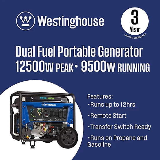 The Westinghouse WGen9500DF Dual Fuel Portable Generator delivers powerful, versatile, and transfer switch-ready energy for home backup, job sites, and RVs. With 12,500 peak watts and 9,500 running watts (gasoline), this generator ensures your home and essential appliances remain powered. It features dual-fuel capability, running on gasoline or propane, a push-button electric start with remote key fob, and a VFT Data Center to keep you informed of voltage, frequency, and runtime.