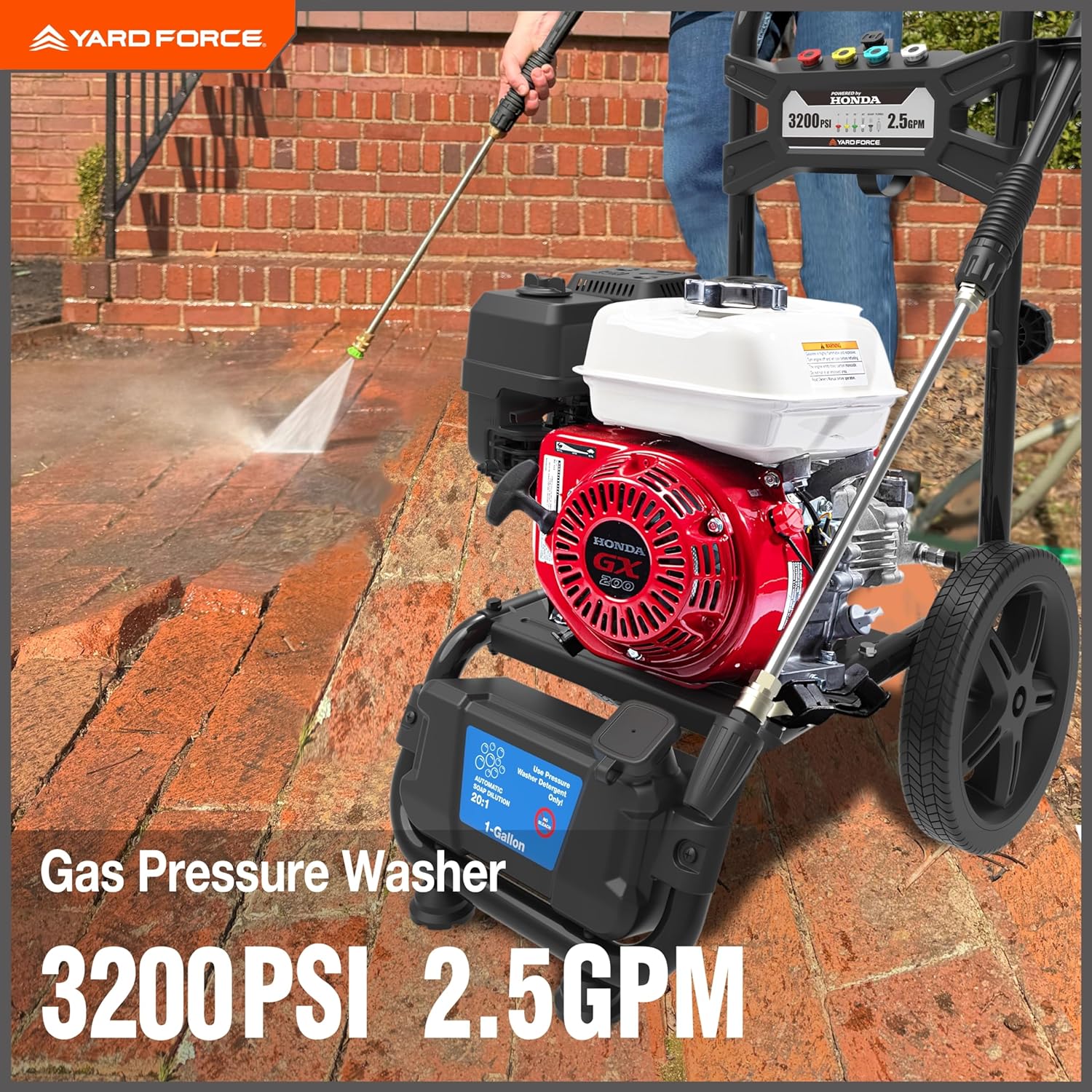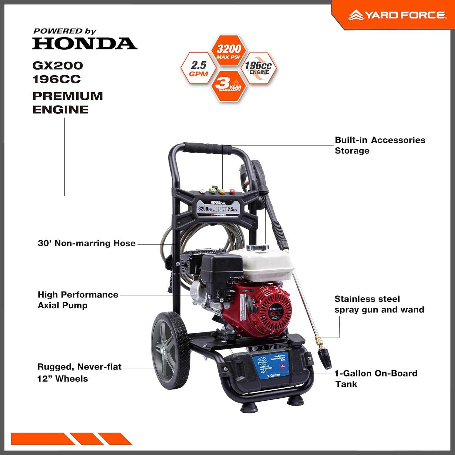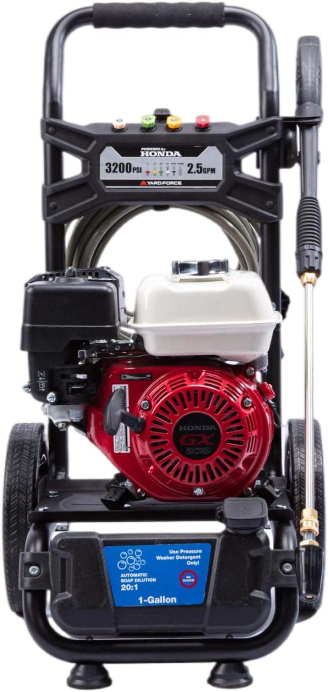 Unleash the power of the Yard Force 3200PSI gas pressure washer, equipped with a Honda GX200 Premium 196cc gasoline powered engine for unmatched performance. Tackle the toughest grime effortlessly with its High-Performance Axial Pump, delivering an impressive 2.5 GPM. Designed for convenience and durability, this pressure washer features a 30ft non-marring grey hose and 12-inch Never Flat Tires, ensuring easy mobility across any terrain.