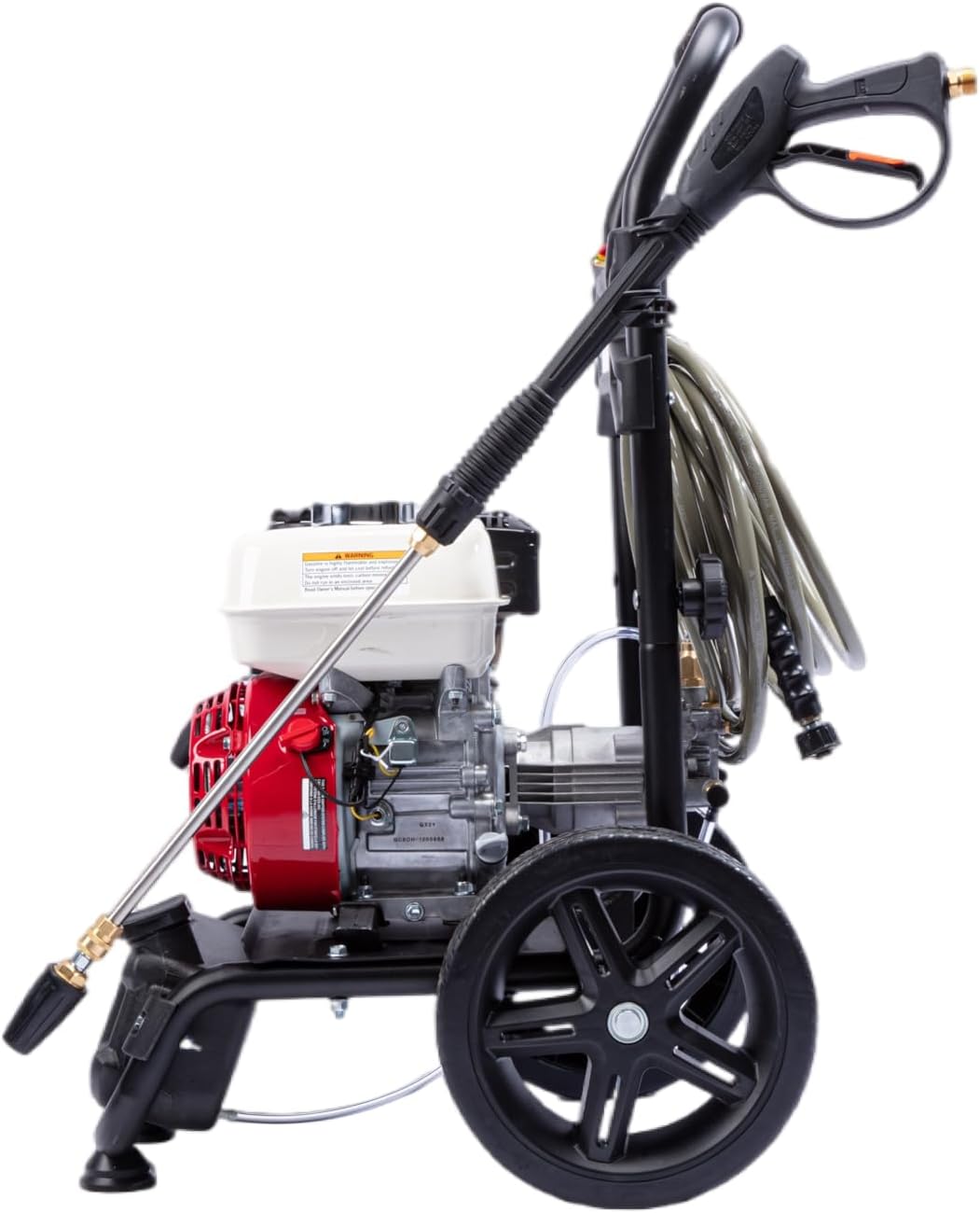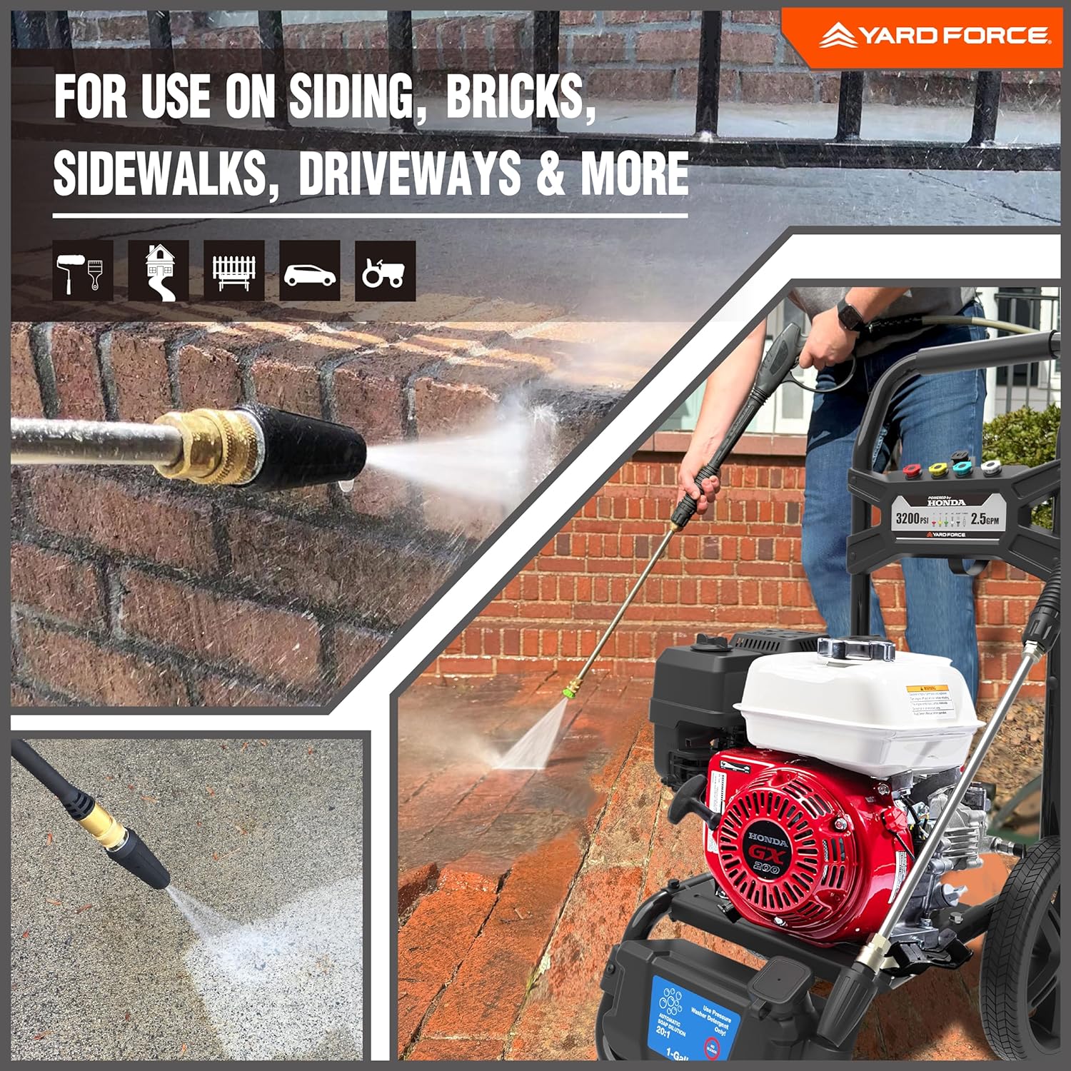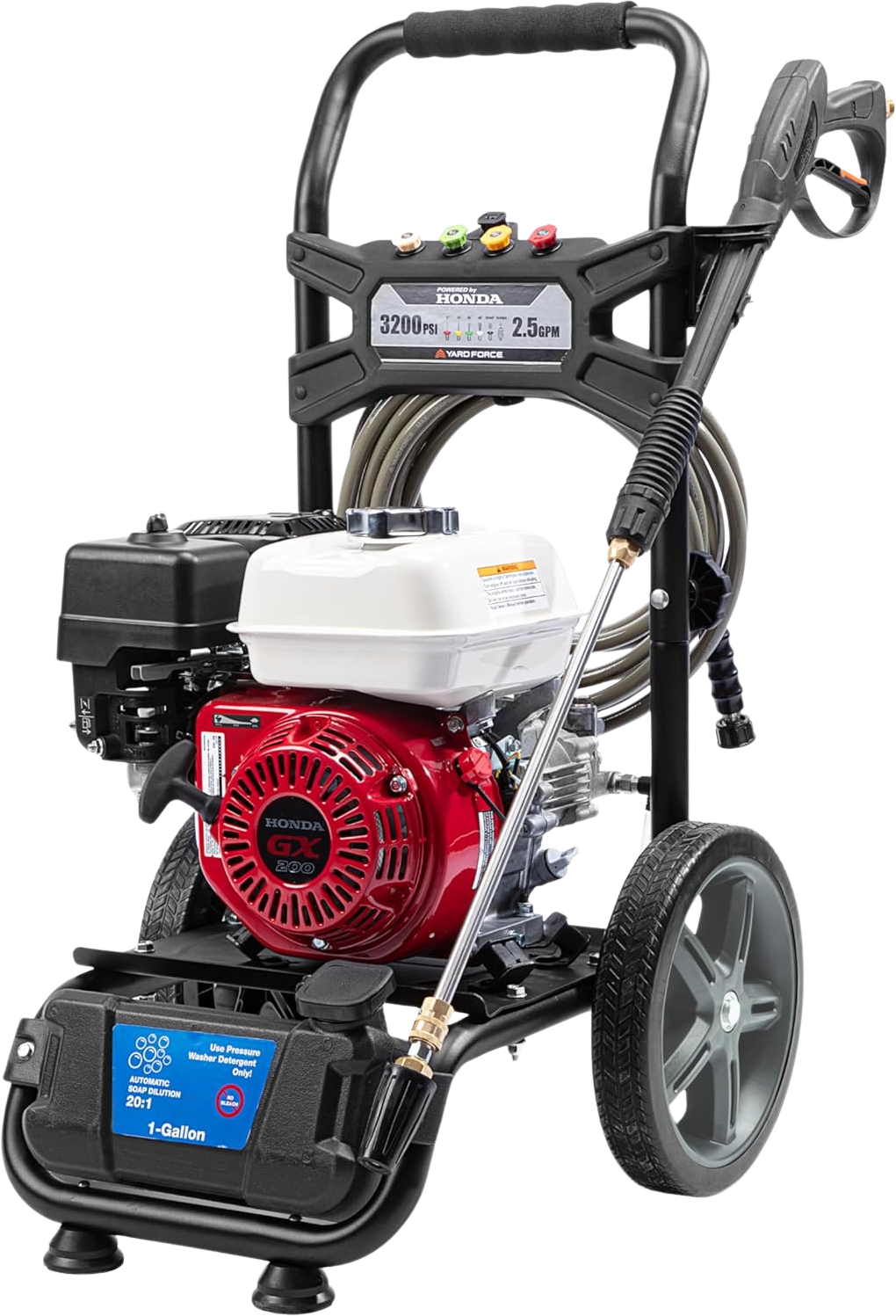 Unleash the power of the Yard Force 3200PSI gas pressure washer, equipped with a Honda GX200 Premium 196cc gasoline powered engine for unmatched performance. Tackle the toughest grime effortlessly with its High-Performance Axial Pump, delivering an impressive 2.5 GPM. Designed for convenience and durability, this pressure washer features a 30ft non-marring grey hose and 12-inch Never Flat Tires, ensuring easy mobility across any terrain.